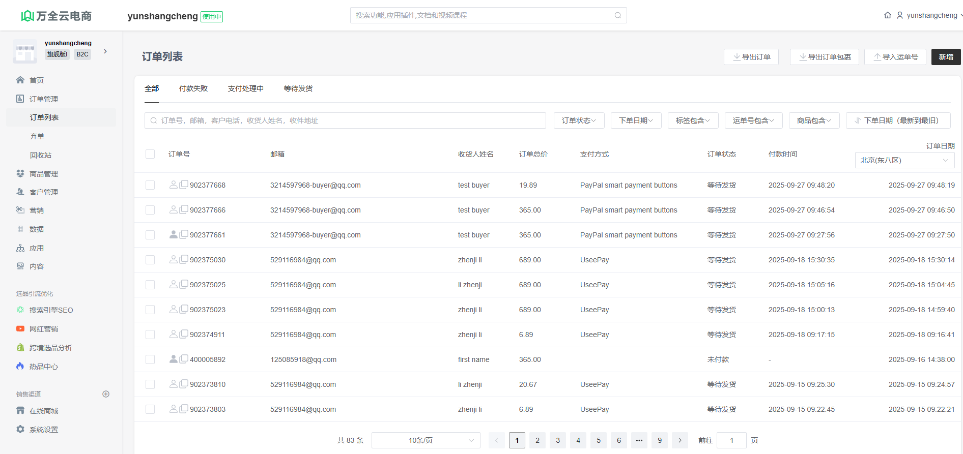 万全云电商订单管理提供订单查询、新增订单、催收未付款订单、订单发货、订单退款、订单取消、查看订单详情及编辑、导出订单、导出包裹列表、导入运单号及批量删除功能。