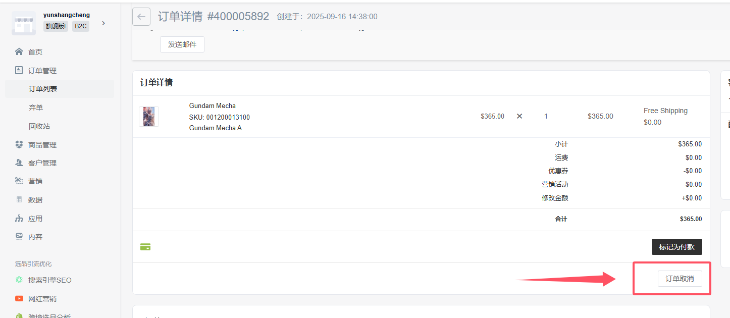 当客户需要取消订单,您可以将订单状态标记为已取消: