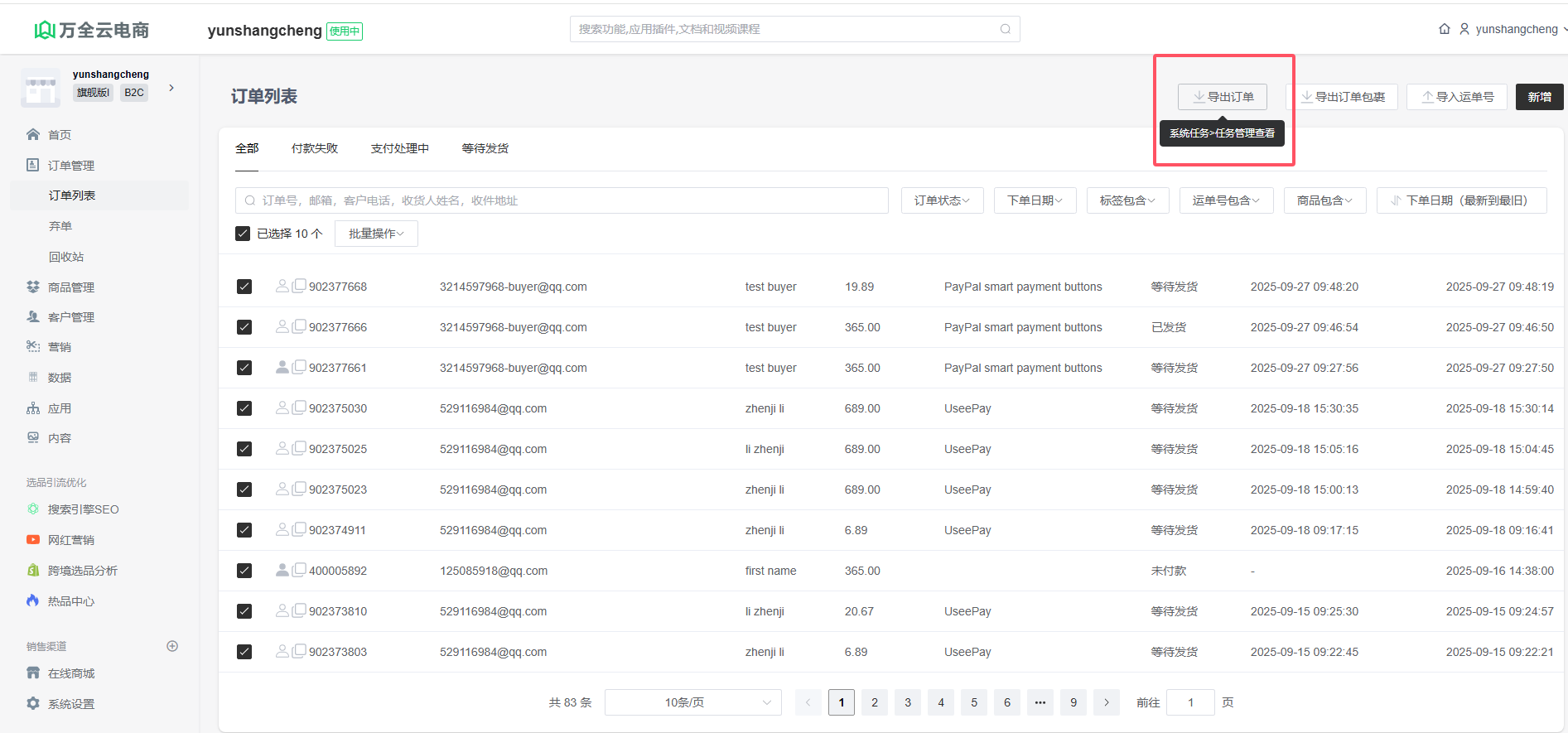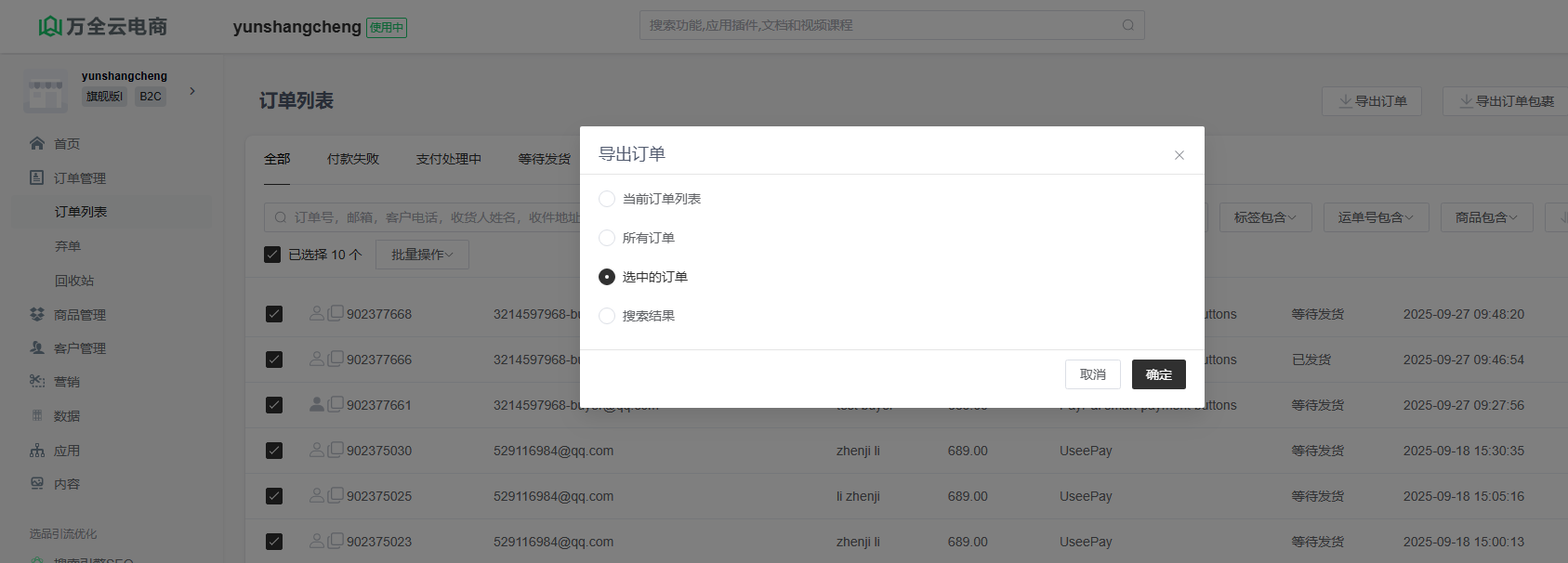 运单号导出功能允许为已收款、未发货、已发货、未付款、订单完成、订单修改、订单号等。导出文件为excel表格,支持excel2003、excel2007