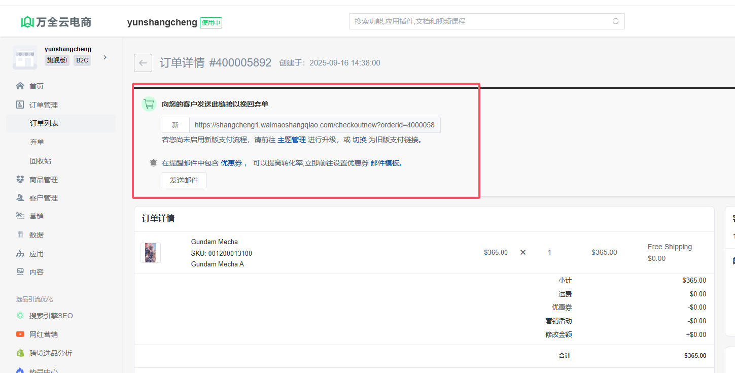 点击订单列表中未付款状态订单的订单号,进入订单详情,如下图所示,可复制付款链接发送给客户进行付款,或直接发送催付邮件给客户。