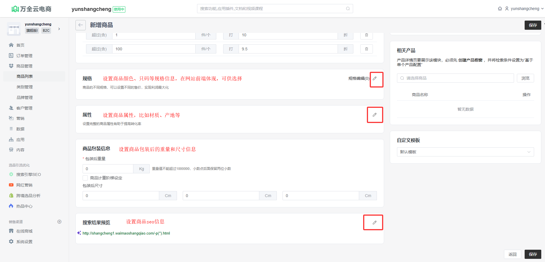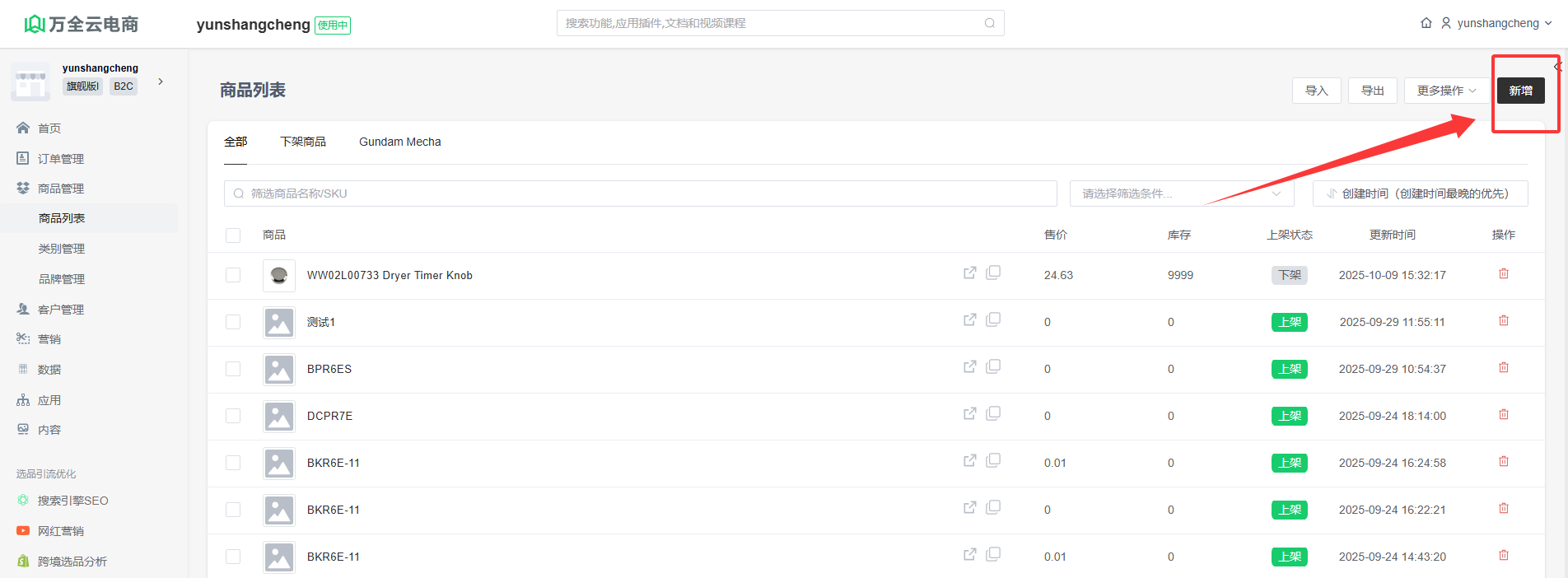 登录网站后台,在“商品列表”页面点击右上角“新增商品”按钮,进入编辑商品信息页面。