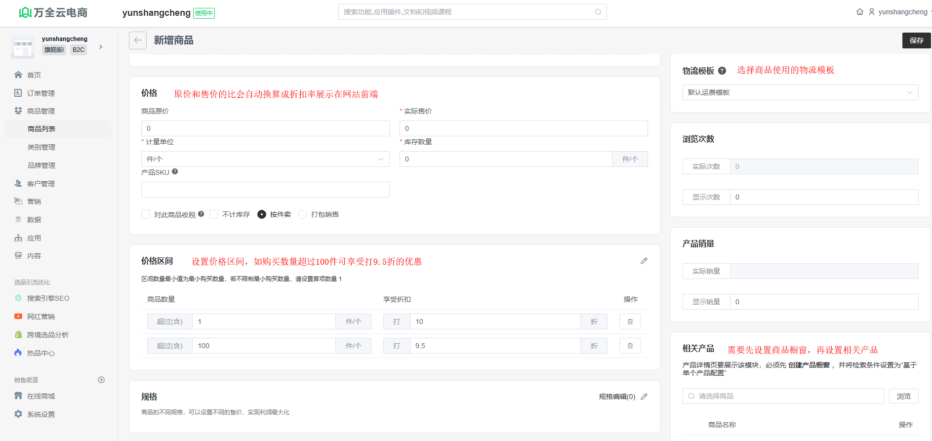 物流模板:选择商品使用的物流模板。