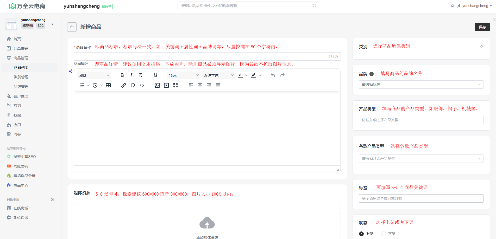商品描述:即商品详情,可以输入富文本、图片、引用视频链接。