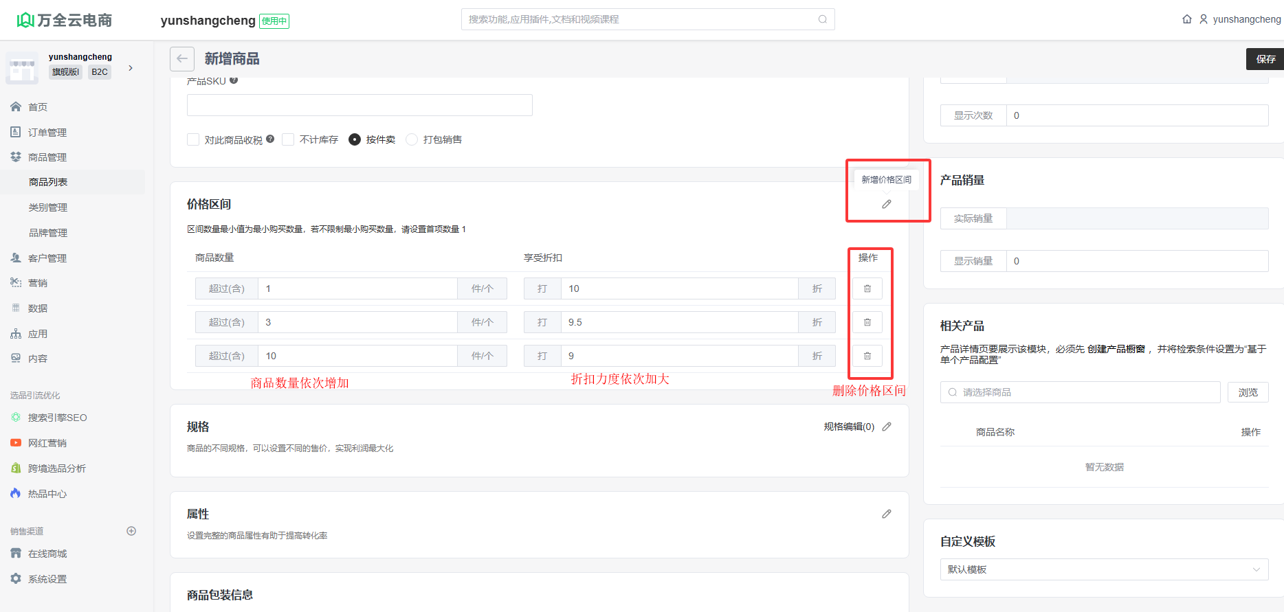 价格区间:设置价格区间阶梯价格,如购买数量超过100件可享受9折的优惠价格。