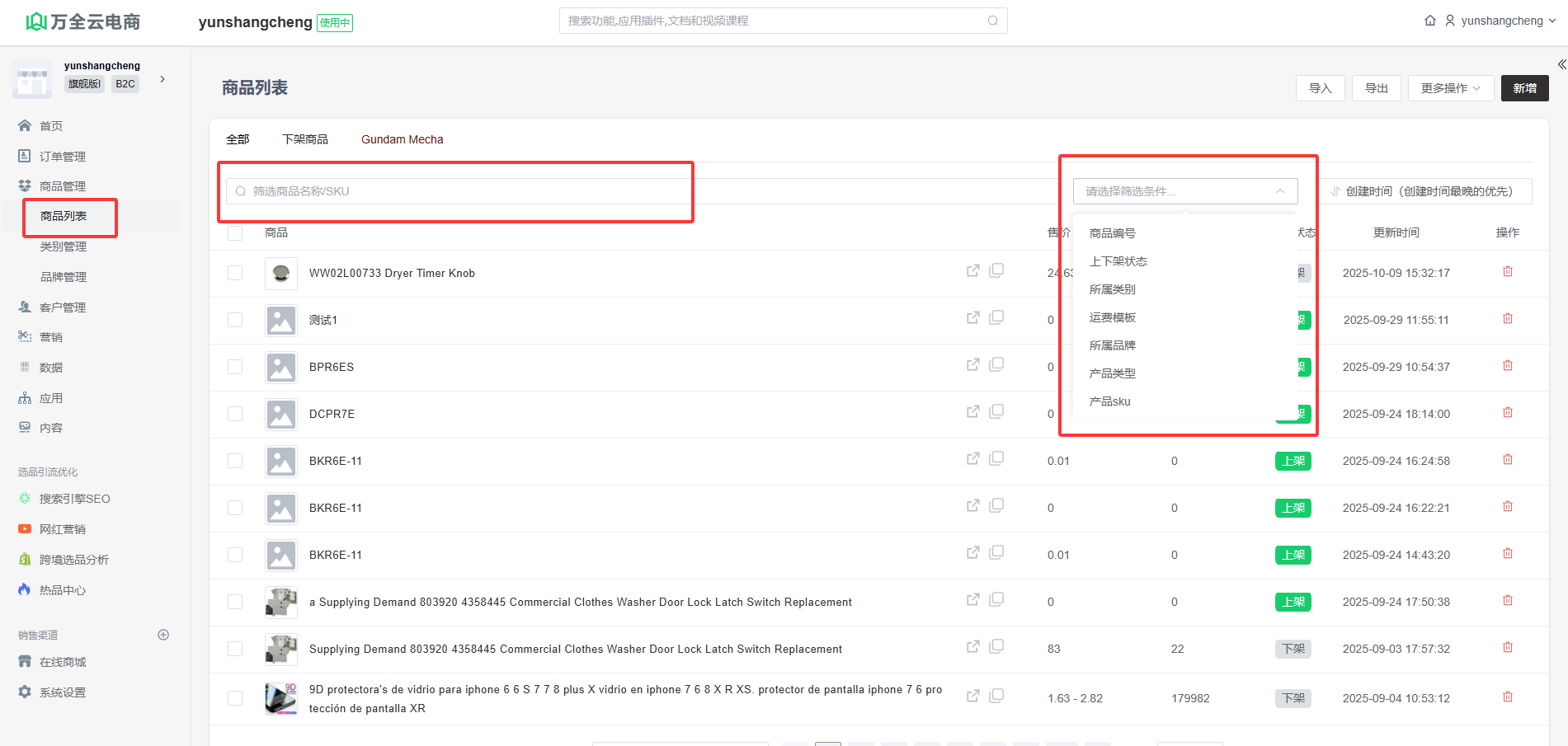 在“商品列表”页面,可以直接输入商品名称的关键词搜索相关产品,也可以通过商品编号、上架状态、所属类别、运费模板、所属品牌、产品类型、产品sku快速查找对应的商品。
