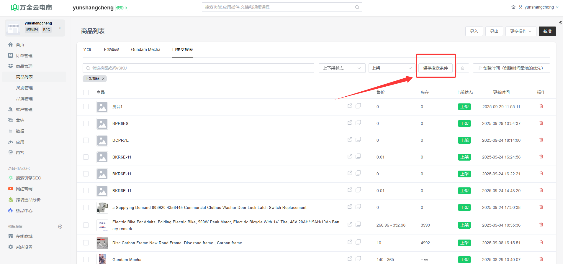 保存搜索条件:可以把搜索结果保存至“全部商品”后面的页签中,以便下次直接查看。