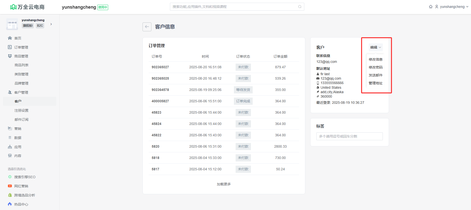 订单详情可查看:客户注册时间、最近登录时间、下单情况及收获地址,同时可以进行修改信息、密码修改、发送邮件及收获地址管理操作。