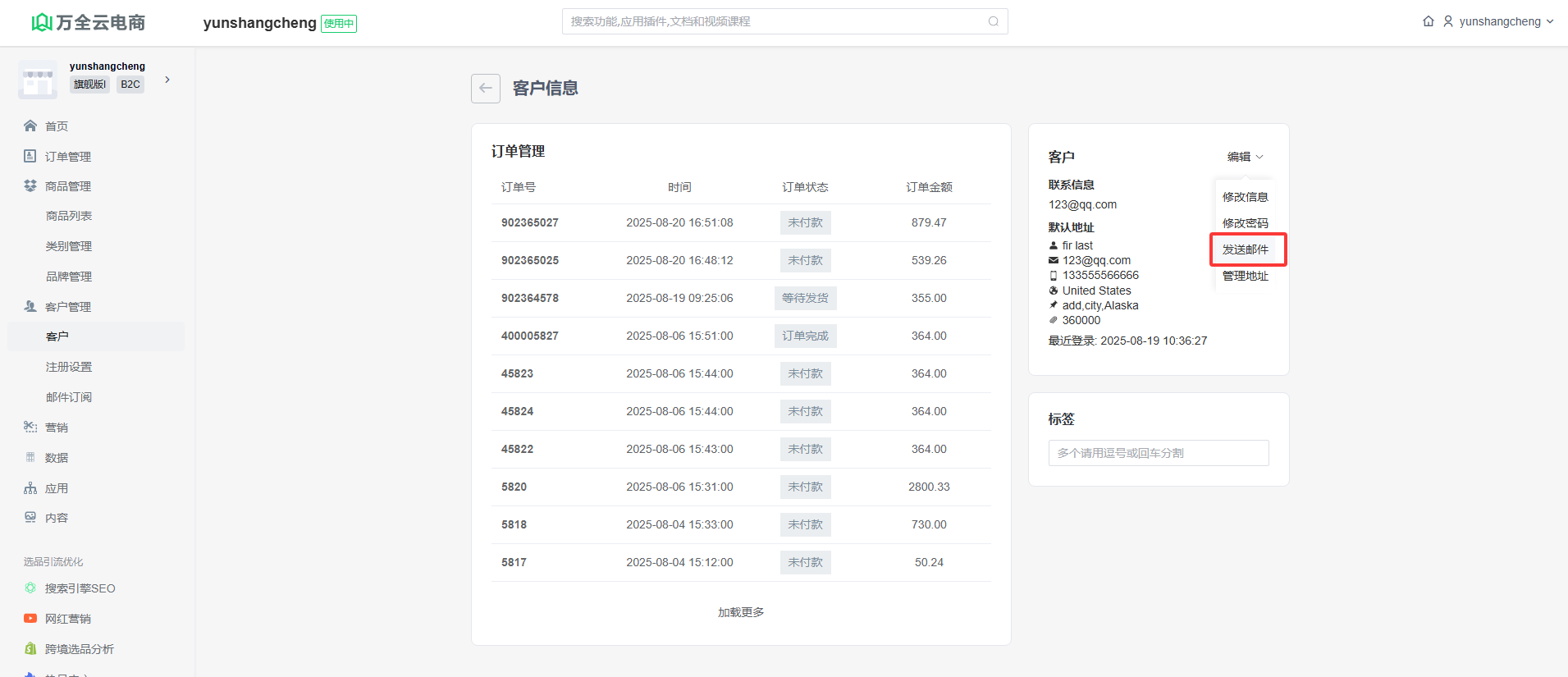 客户详情页面,点击“发送邮件”可给该客户发送邮件;