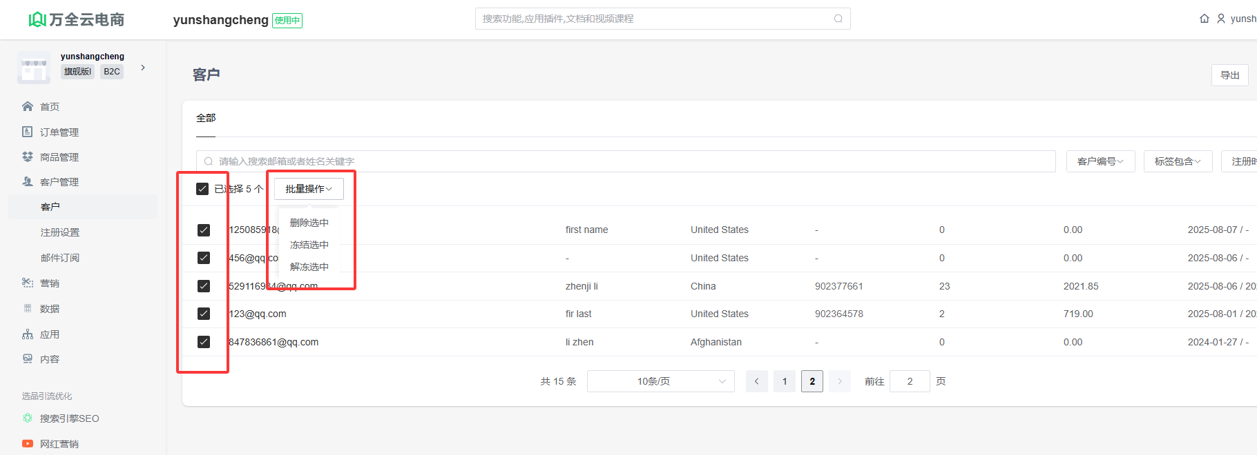 登录网站后台,点击“客户管理”进入客户列表页面,勾选左侧复选框,点击批量操作,可执行批量删除、冻结、解冻操作。