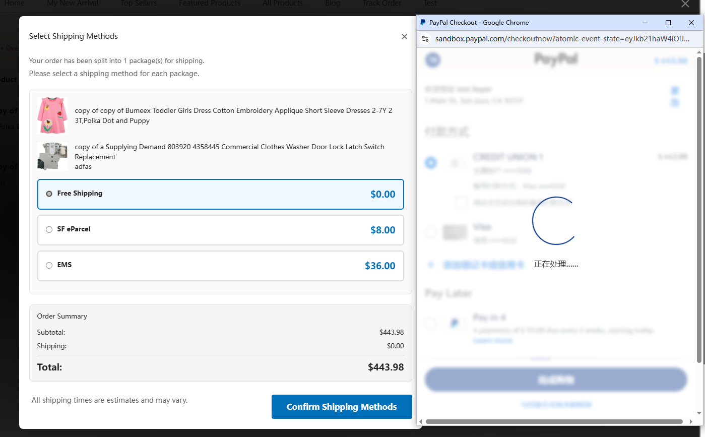 (5) 点击paypal付款之后将会弹出根据用户贝宝账户所填写的地址显示出对应的物流模板,同时如果有设置运费税,也会加上(最新加上的新功能)