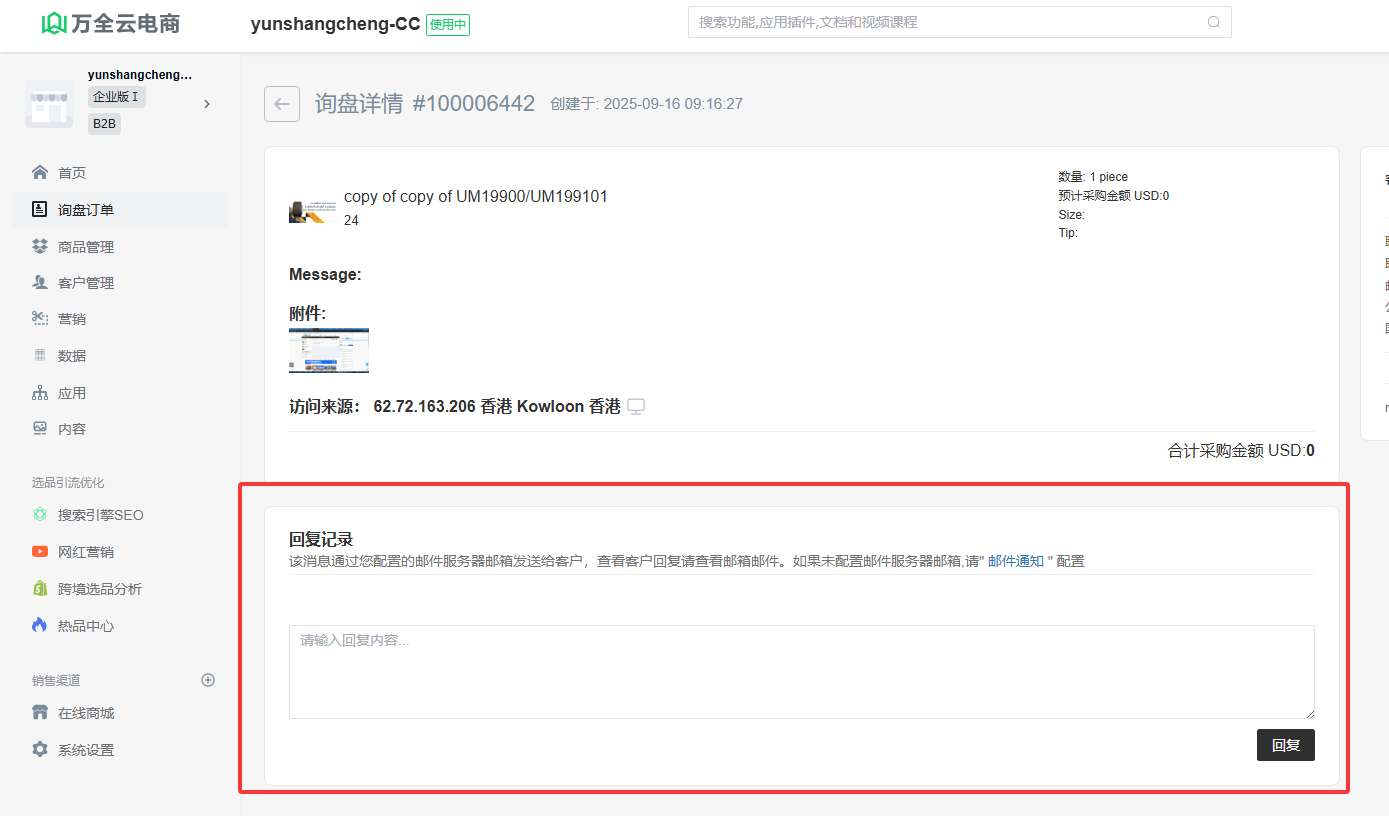 在询盘列表中,点击“询盘编号”进入订单详情底部,输入回复内容,点击回复: