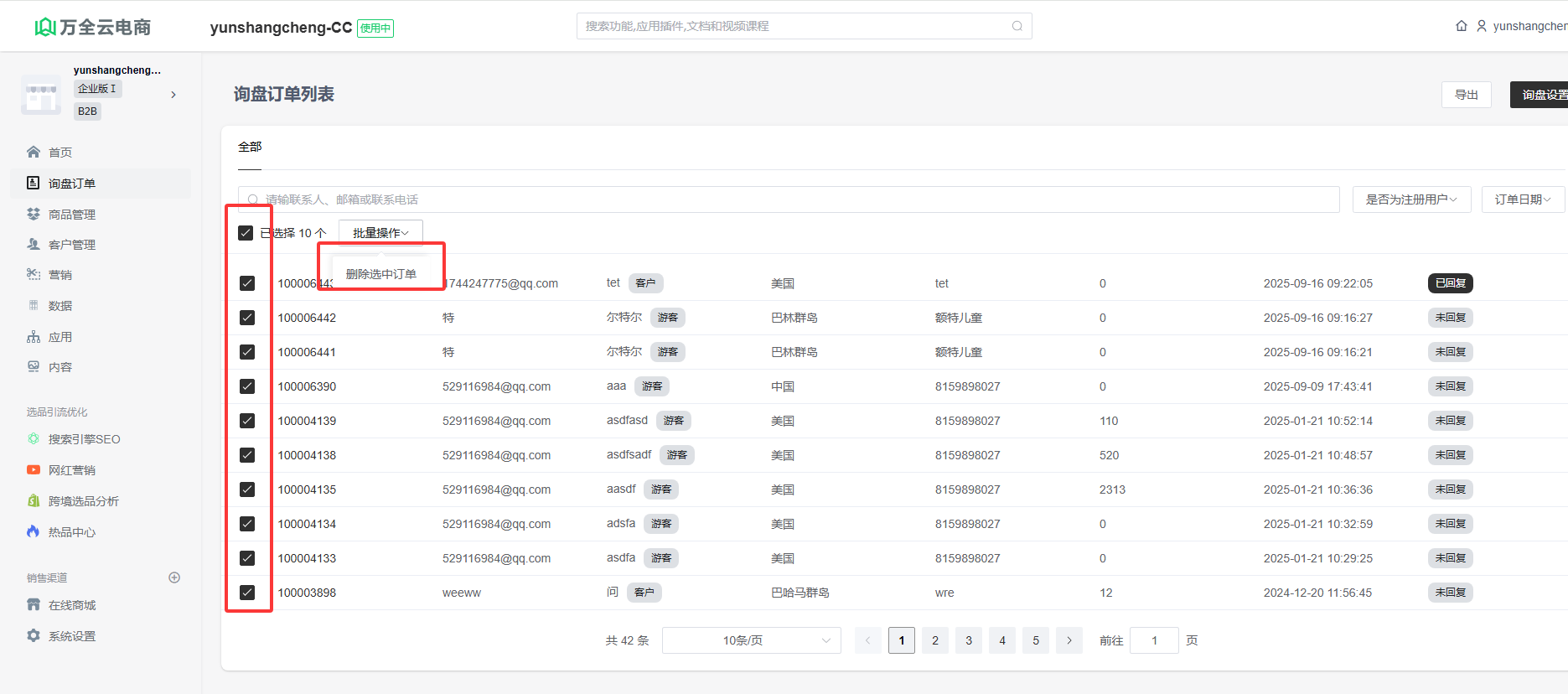 在询盘列表中,勾选列表左侧复选框,选择需要删除的订单,点击删除选中,订单删除完成。