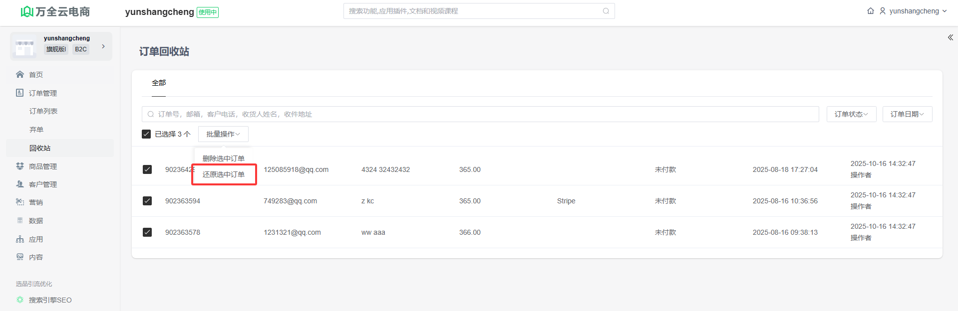 选中需要还原的订单,点击批量操作,还原选中订单,点击确定,订单将还原到订单列表中。