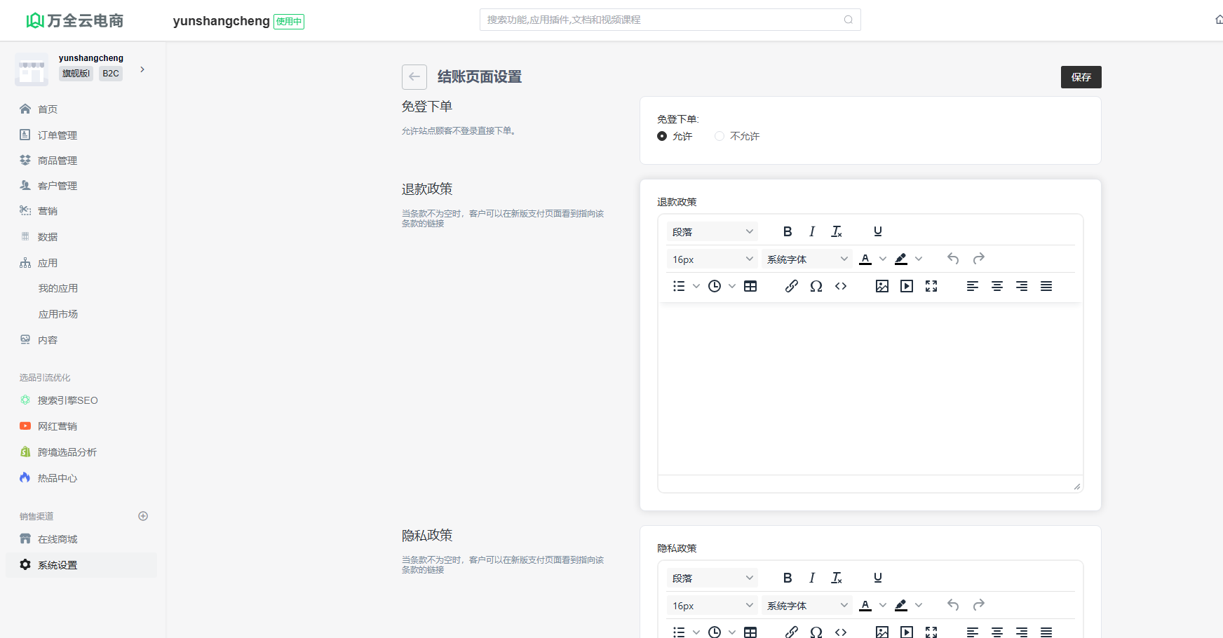 自定义前端在线结账流程,管理结账页面退款、隐私、服务、航运政策。