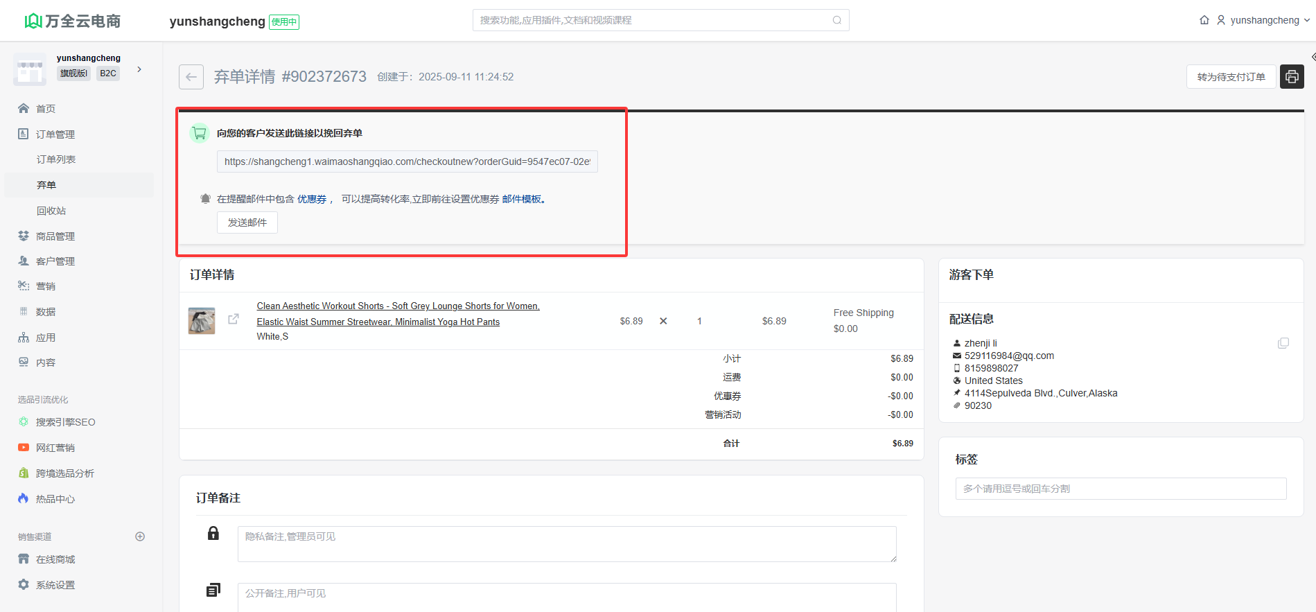 点击弃单列表中的订单号,进入订单详情,订单详情顶部可以复制付款链接及直接通过通过邮件通知客户付款。
