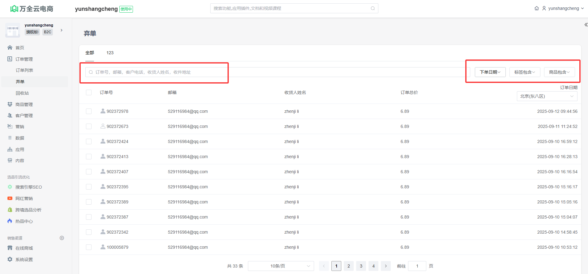 在弃单列表页面,根据“下单日期、订单标签、商品包含、订单编号、邮箱、客户电话姓名及地址”查询相关订单信息。