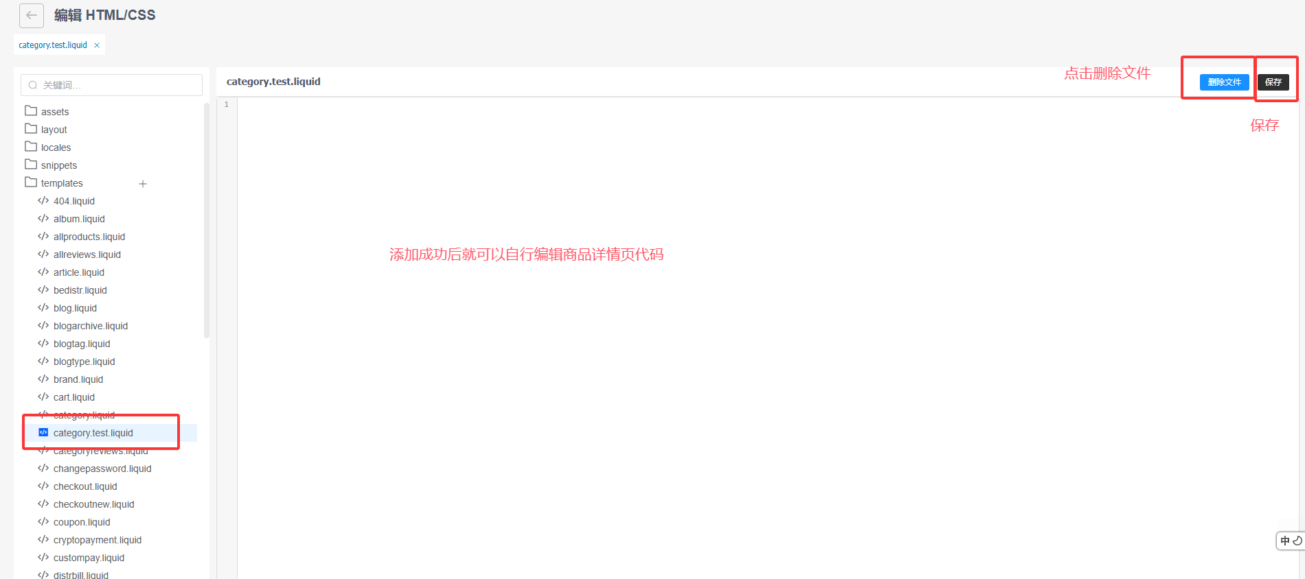 4.添加成功之后就可以自行编辑商品类别页代码,点击删除文件按钮可以删除模板文件