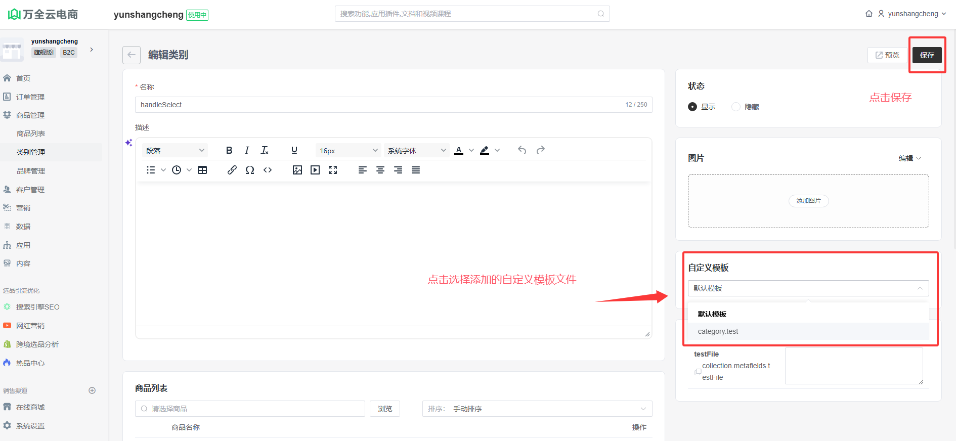 5.模板文件添加完成之后,需要显示这个自定义模板的类别到后台类别编辑里选择自定义模板文件,点击保存后这个商品类别就显示所选择的自定义模板页面,默认所使用的是默认模板