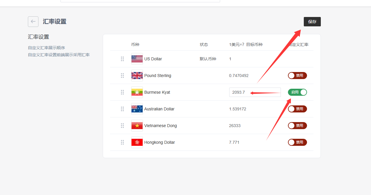 点击汇率设置进入,自定义汇率设置为开启,并输入目标币种汇率,点击保存,完成设置。