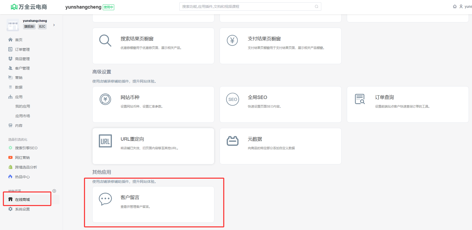 登录商城后台,如图点击“在线商城-客户留言”,进入设置页面。
