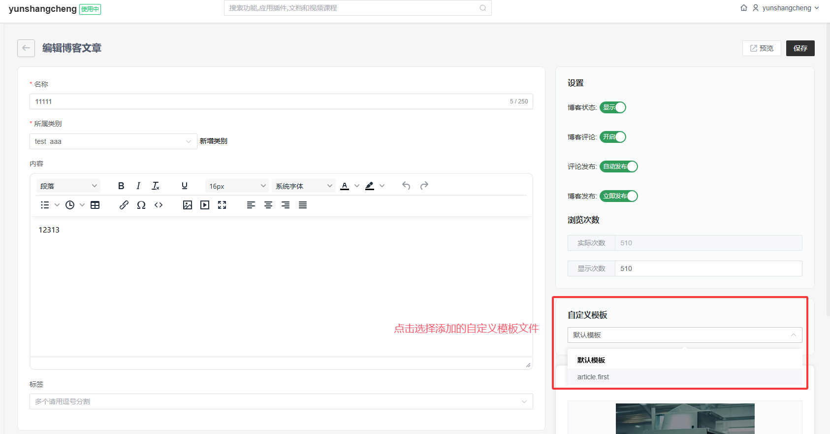 5.模板文件添加完成之后,需要显示这个自定义模板的博客到后台博客编辑里选择自定义模板文件,点击保存后这个博客就显示所选择的自定义模板页面,默认所使用的是默认模板