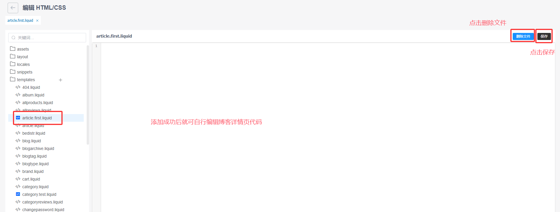 4.添加成功之后就可以自行编辑博客详情页代码,点击删除文件按钮可以删除模板文件