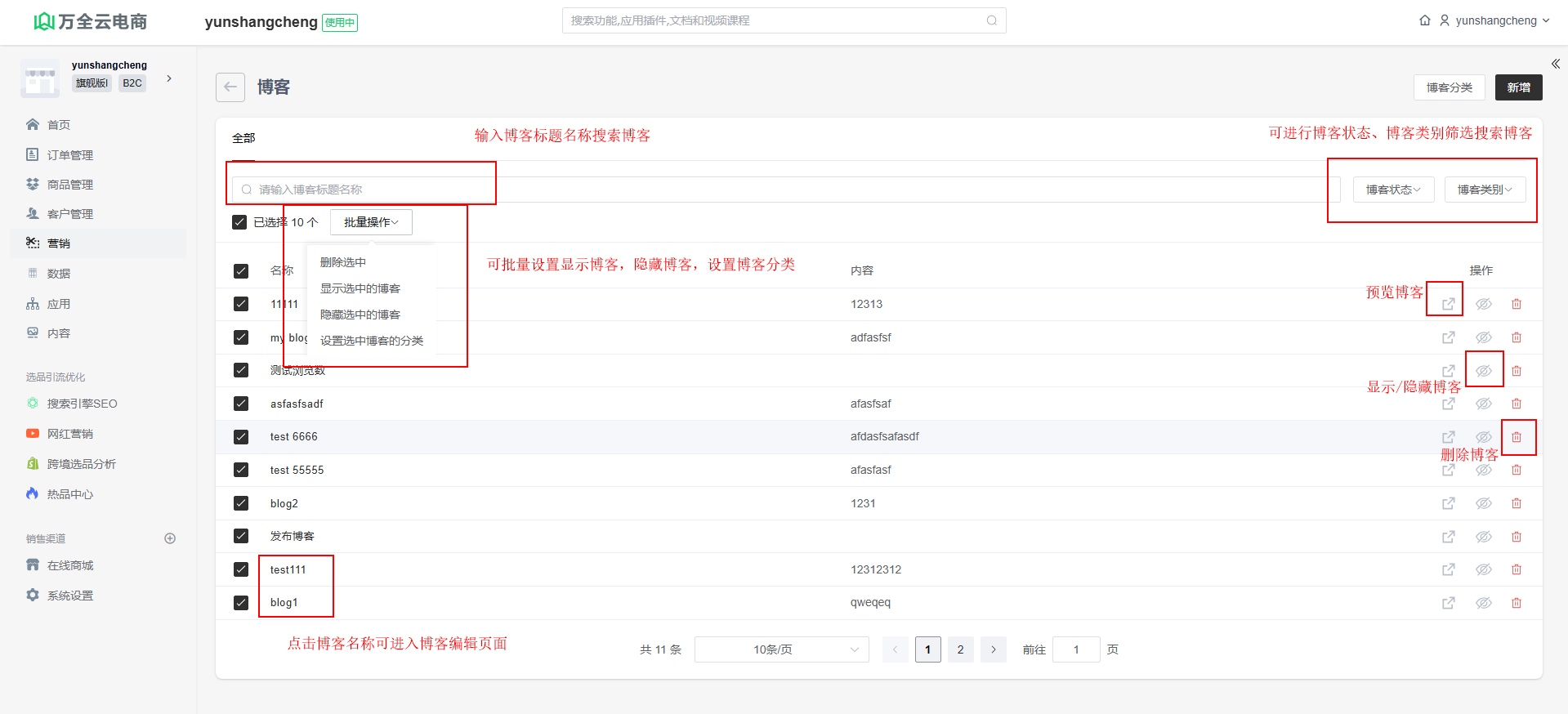 可以进行查找博客、编辑博客、预览博客、删除博客