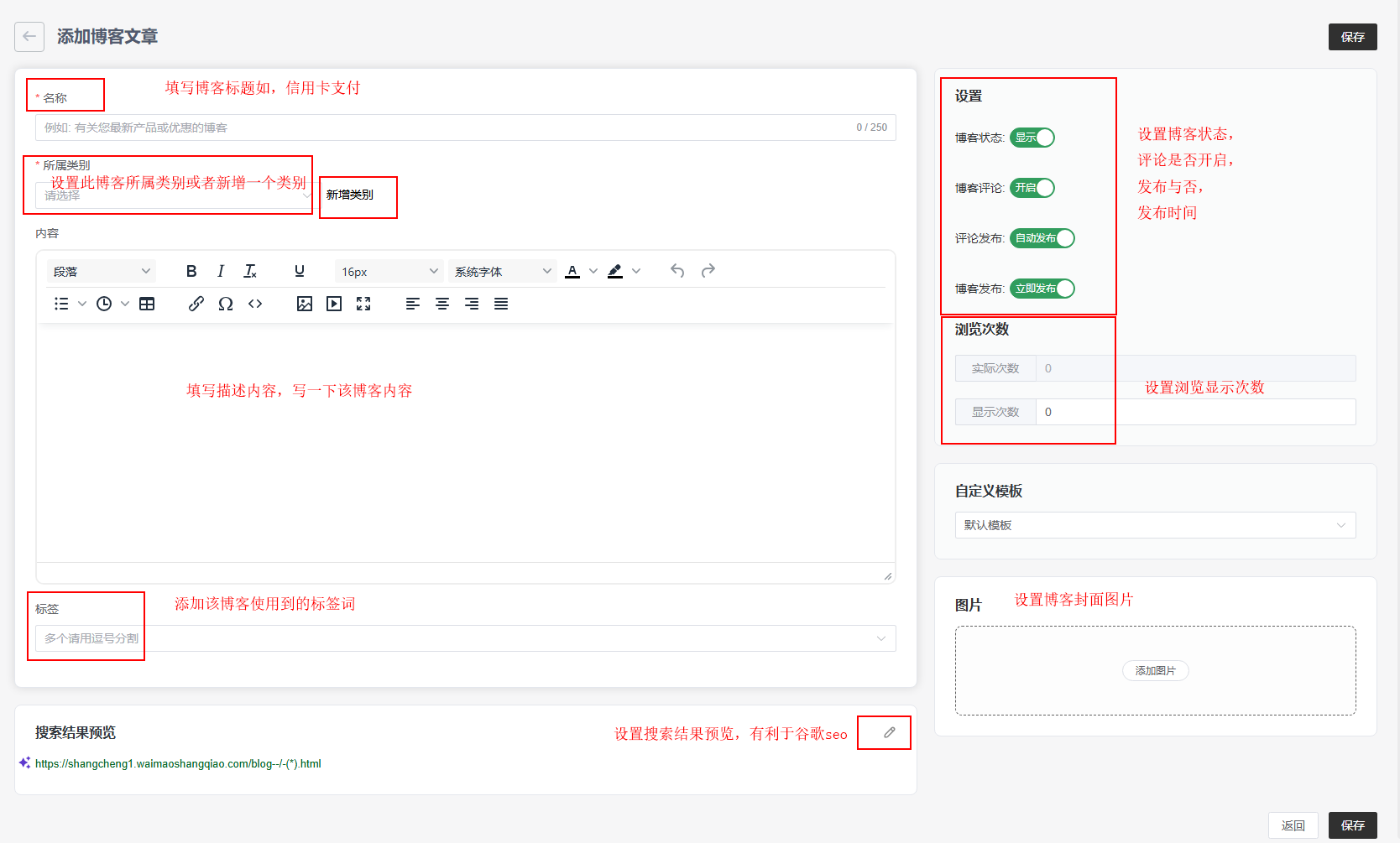 搜索结果预览:设置博客的SEO内容,包括页面标题、关键词、描述;
