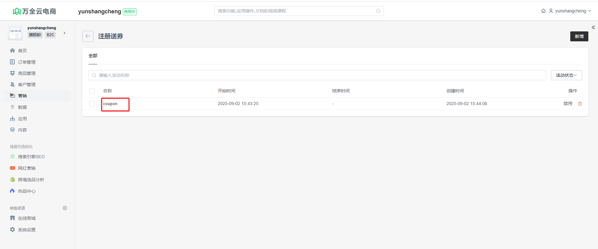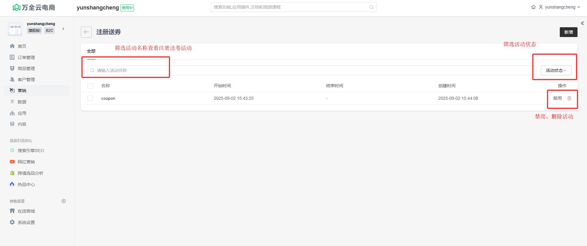 可以进行查找注册送券活动、禁用/启用注册送券活动、删除注册送券活动。