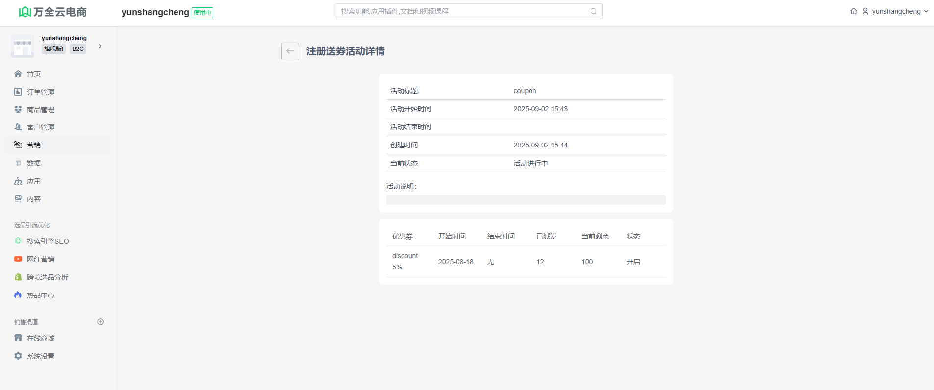 查看活动:点击活动名称查看注册送券活动派发情况。