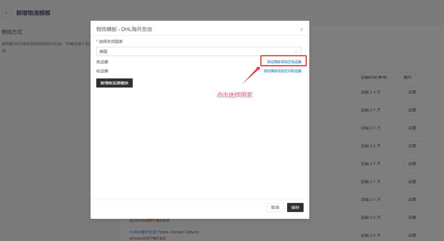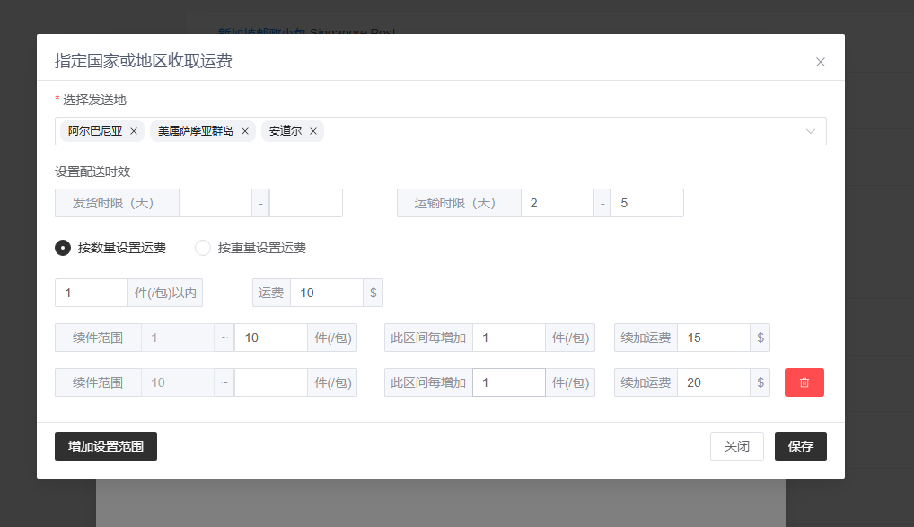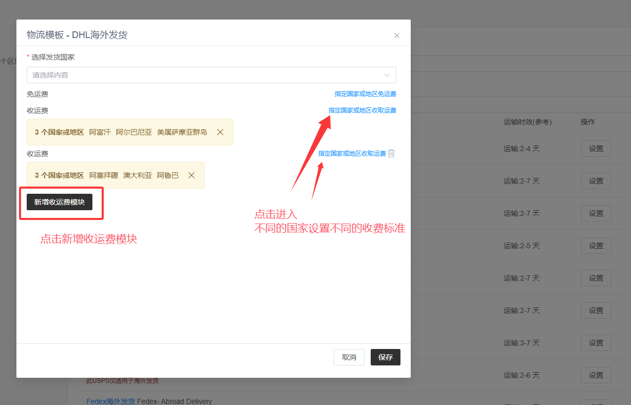 点击“新增收费模块”,可对不同的国家设置收运费标准。