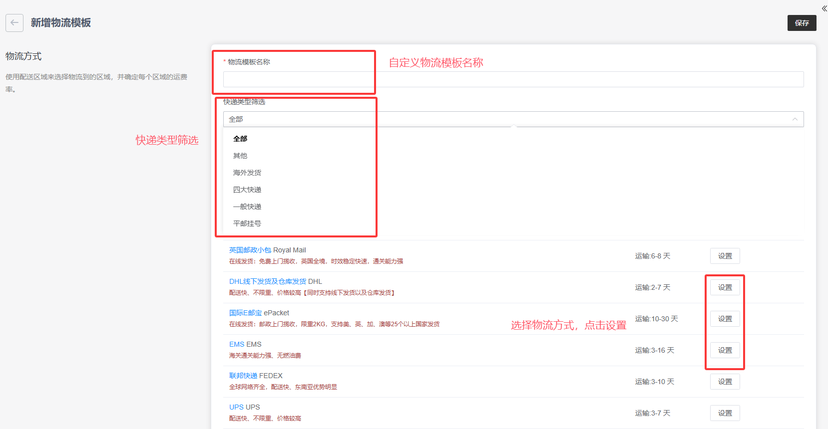 填入物流模板名称、筛选快递类型、选择物流方式,根据需要对配送方式的收费规则进行设置。