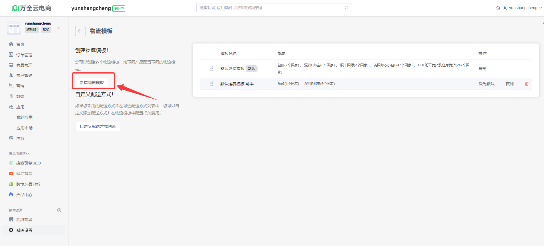 点击“新增物流模板”,进入新增物流模板编辑页面。
