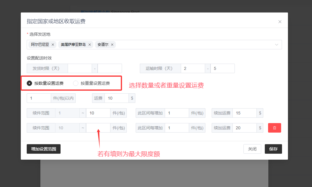 收费类型可根据数量或重量进行收费。在一种配置方式中可根据需要对不同的重量或数量区间配置不同的收费标准。也可增加设置范围,若最后一个区间有上限值则超过这个上限值将无法选择这种配送方式。