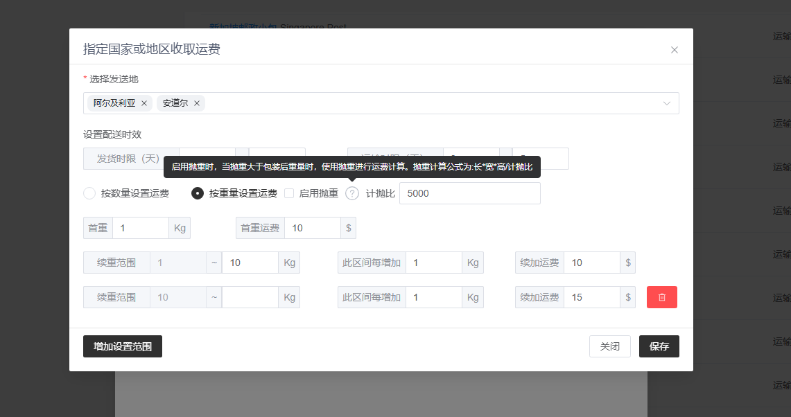 启用抛重时,当抛重大于包装后重量时,使用抛重进行运费计算。抛重计算公式为:长*宽*高/计抛比