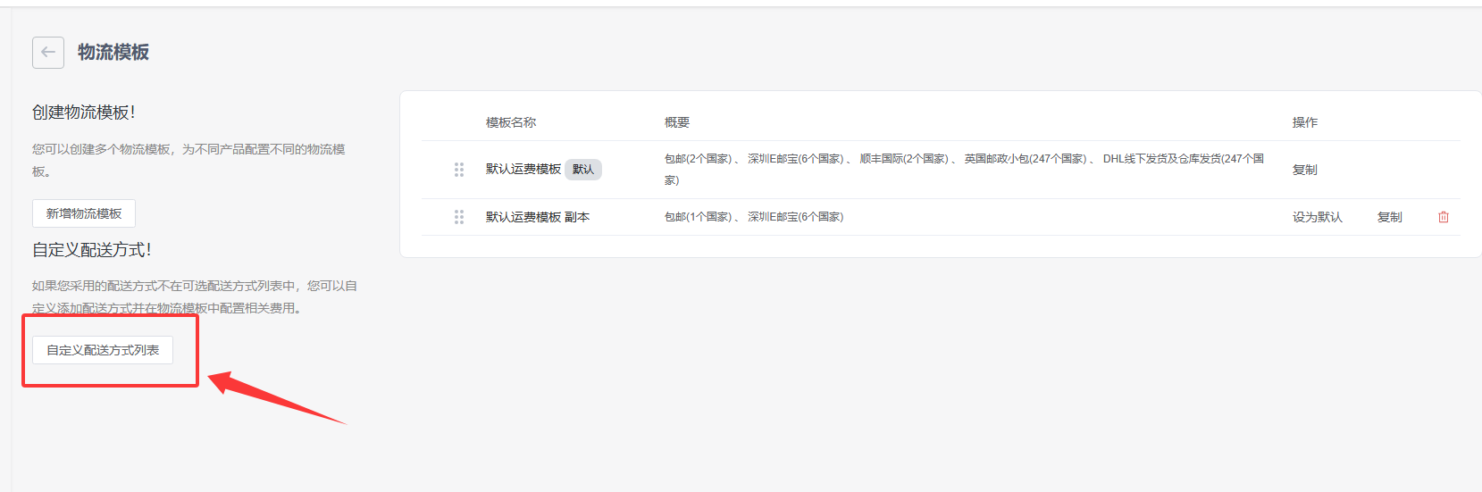 登录网站后台,点击“系统设置”—“物流模板”,点击“自定义配送方式列表”。