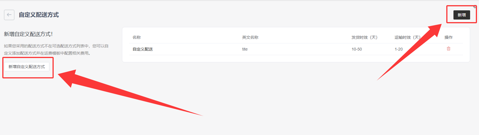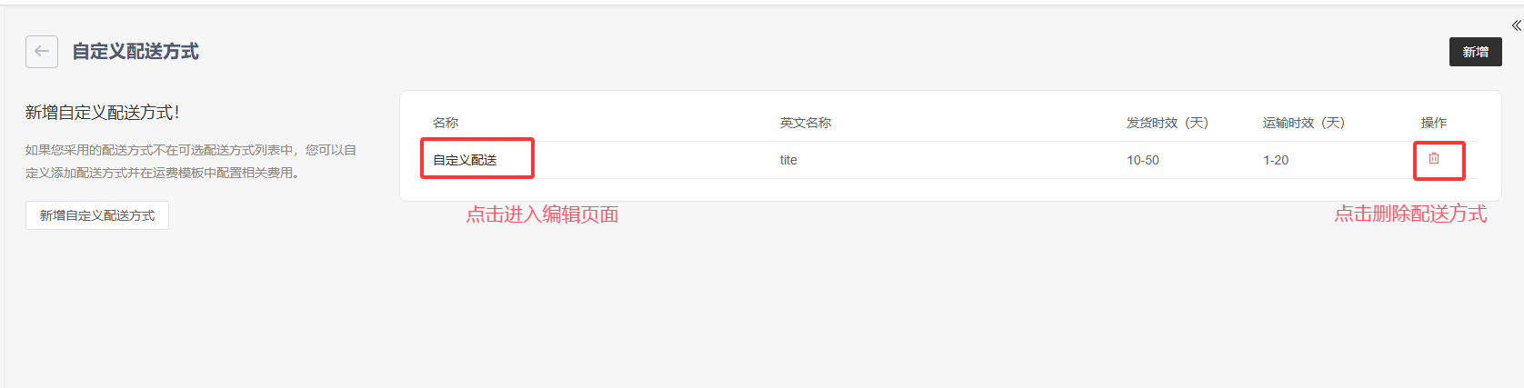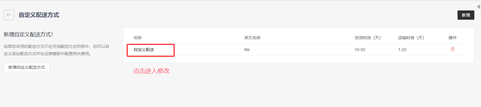 对自定义配送方式进行管理,可对自定义配送方式点击进入编辑页、删除。