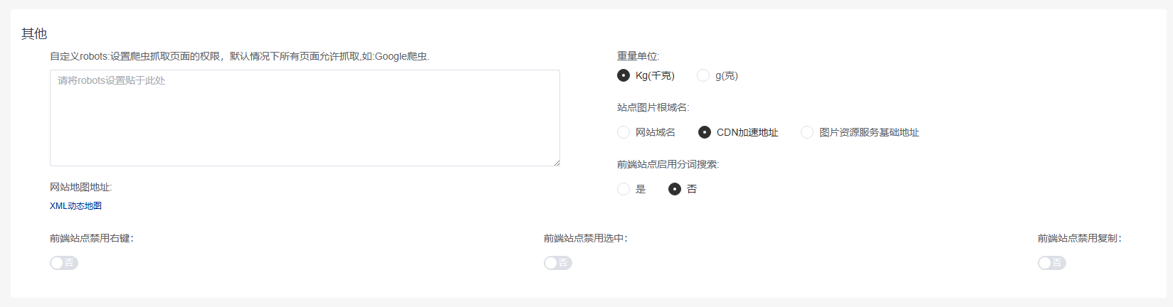 设置网站Robots文件、重量单位、CDN加速、前端站点是否启用分词搜索、设置前端站点是否禁用右键、选中、复制功能;