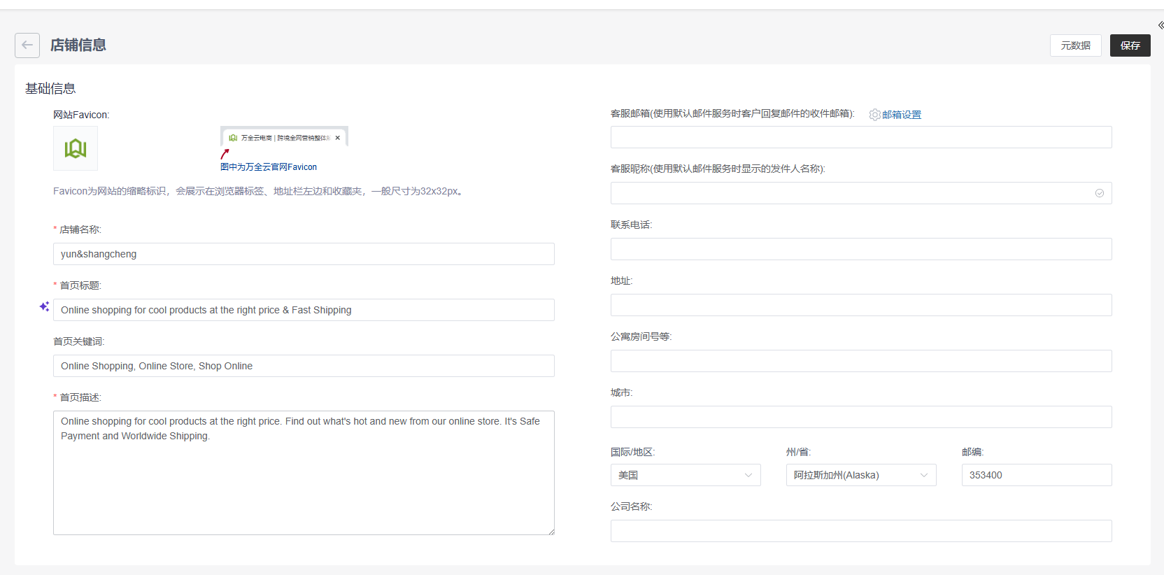 包括店铺名称、首页标题、关键词、描述,网站Favicon、商户联系信息设置。