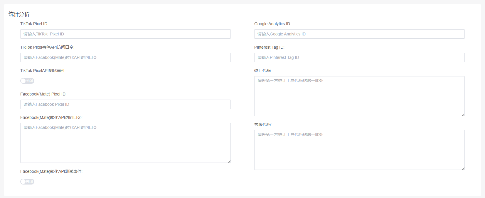 包括Google Analytics ID、Facebook(Mate) Pixel ID、Pinterest Tag ID、TikTok Pixel ID、统计代码、客服代码设置。