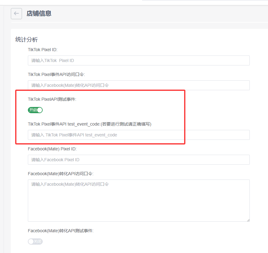19、在万全云商城后台-点击启用TikTok PixelAPI测试事件,填入测试代码,然后点击页面右上角保存