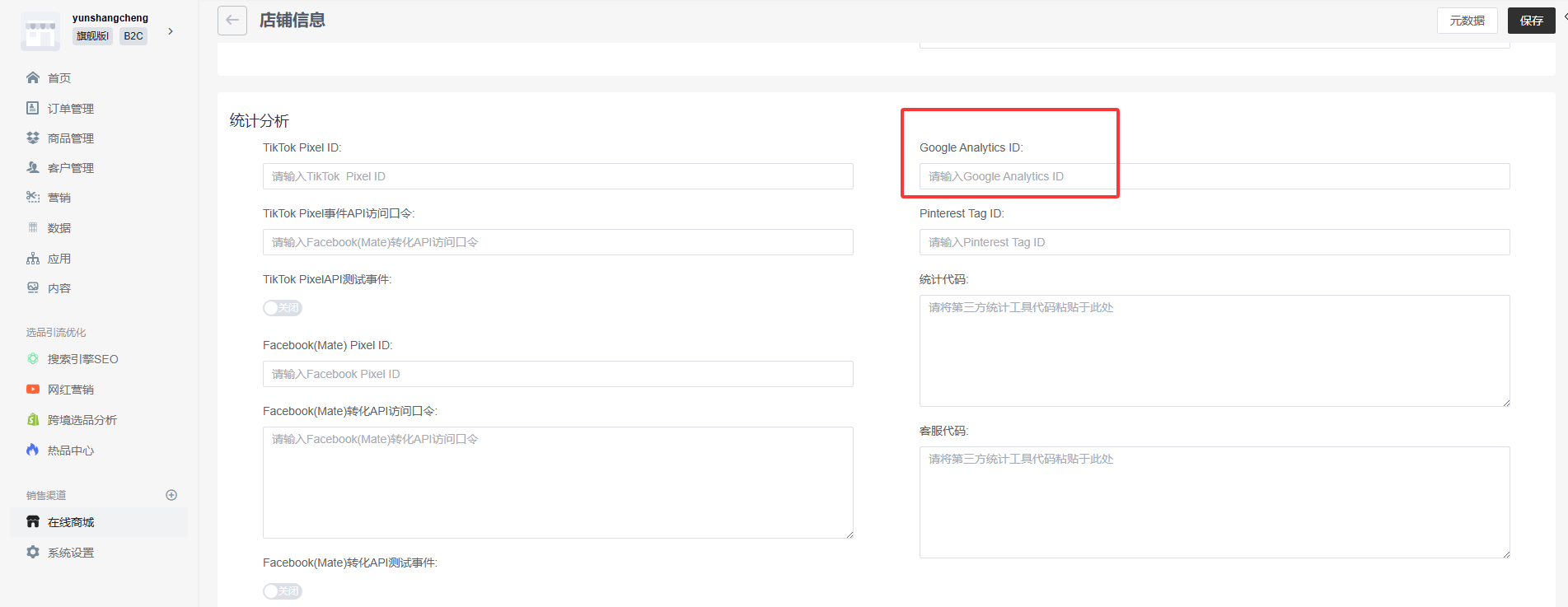 复制您的代码ID,点击“在线商城—“店铺信息”,把复制的ID填写至Google Analytics ID,并保存。