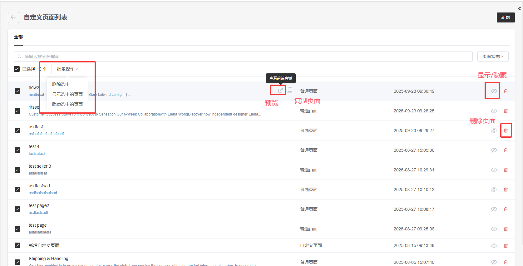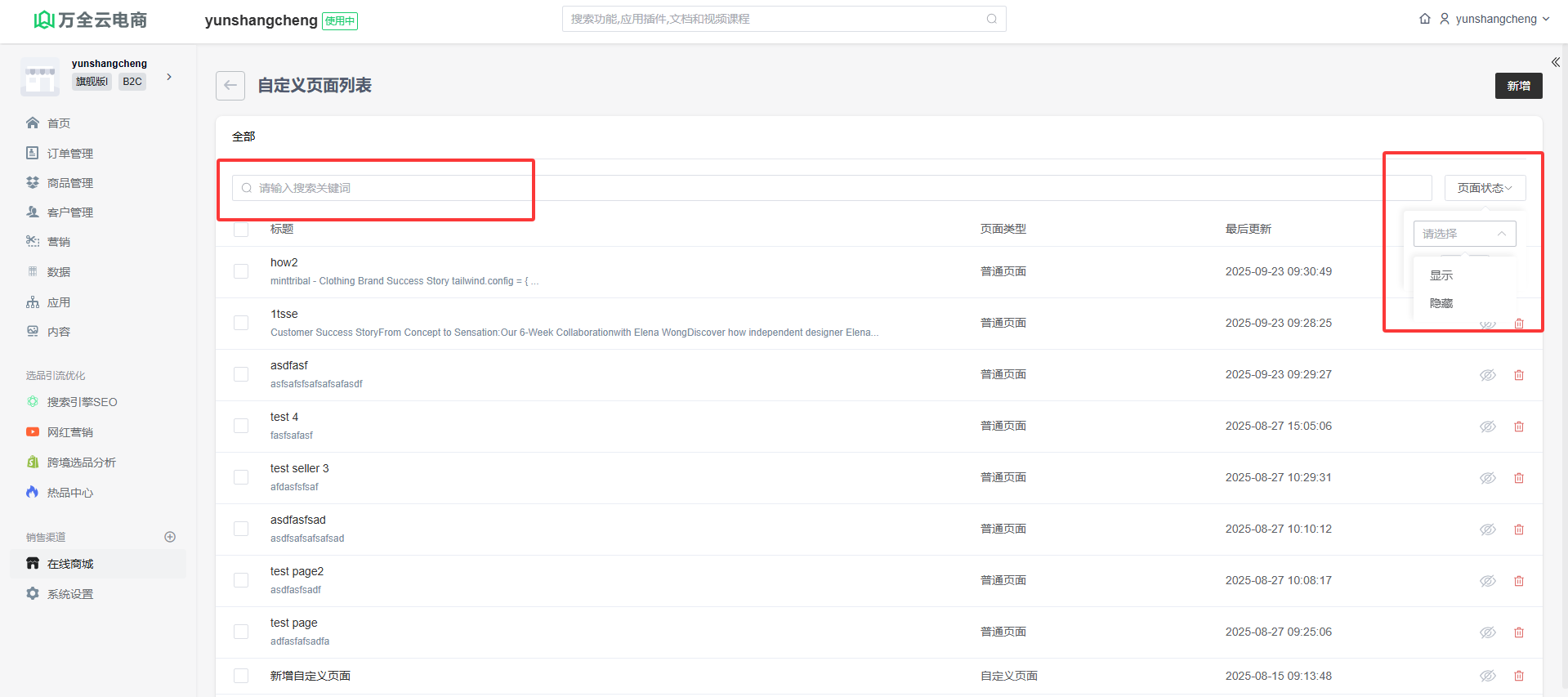 可以通过页面状态及关键词条件查询相关的自定义页面。