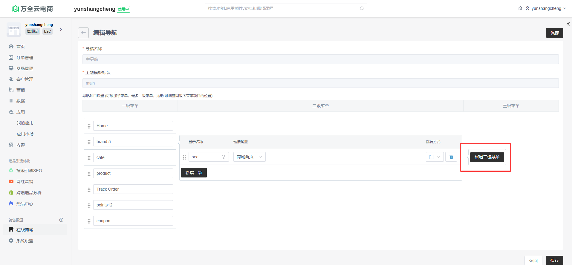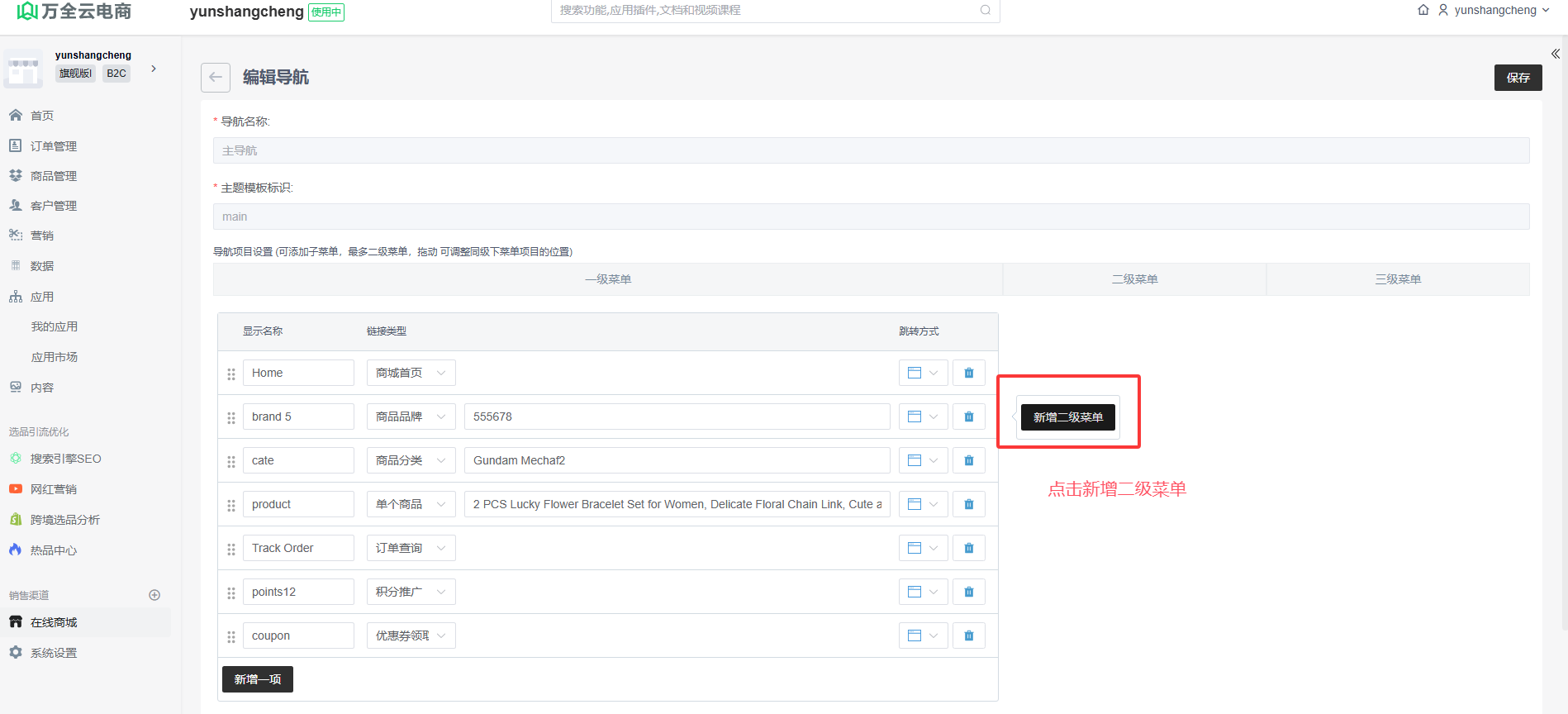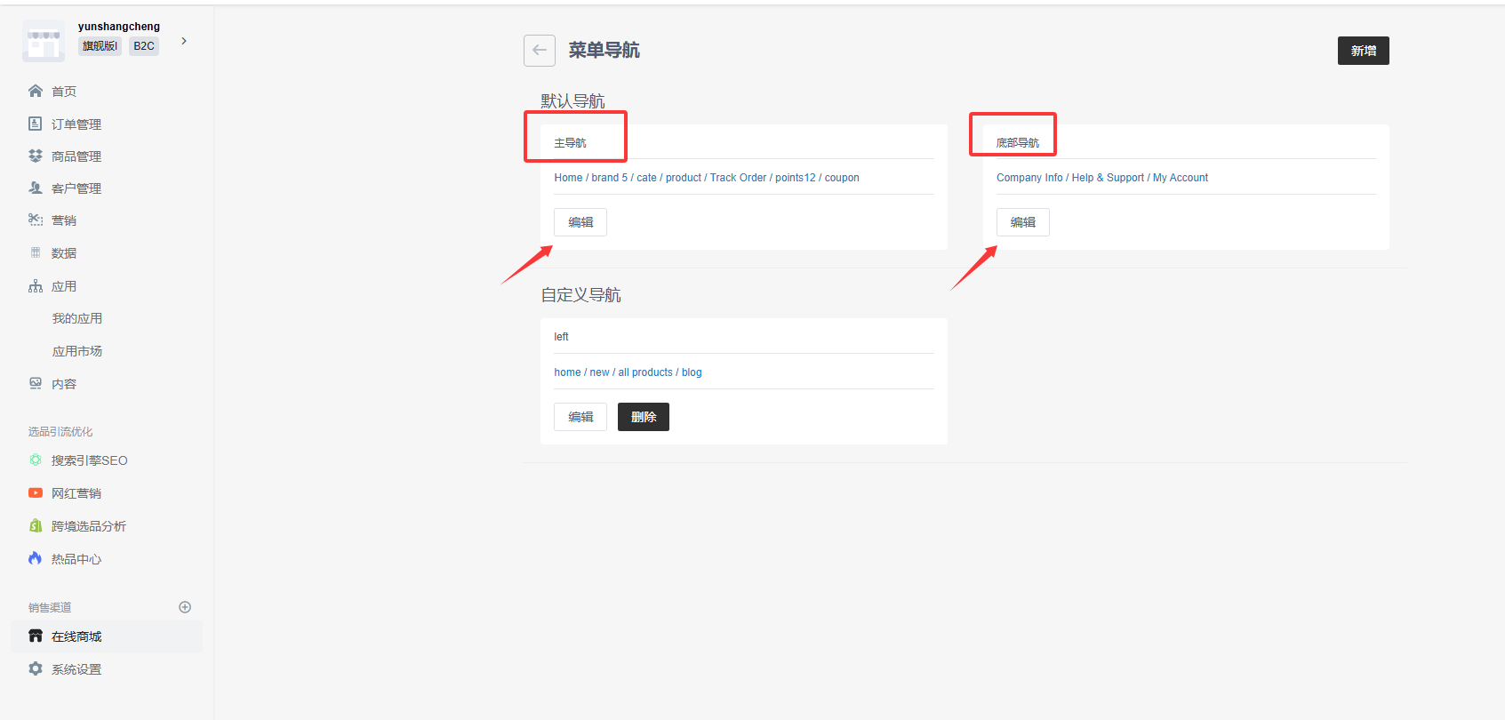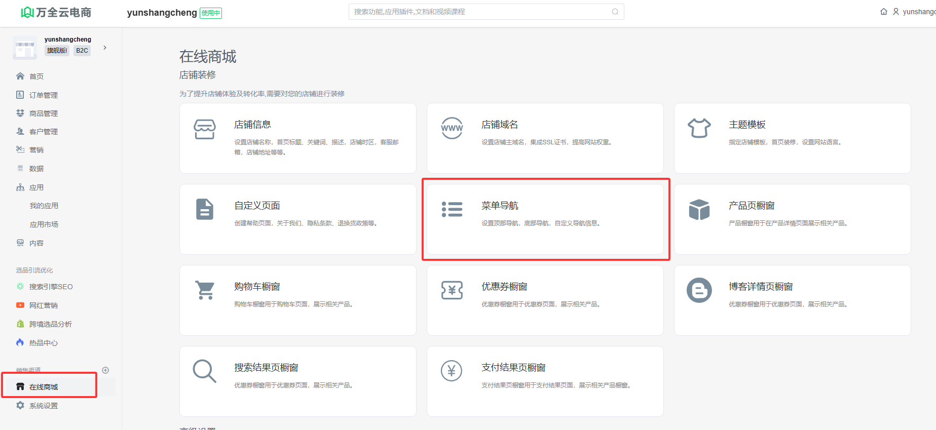 登录网站后台,点击“在线商城”—“菜单导航”进入菜单导航页面