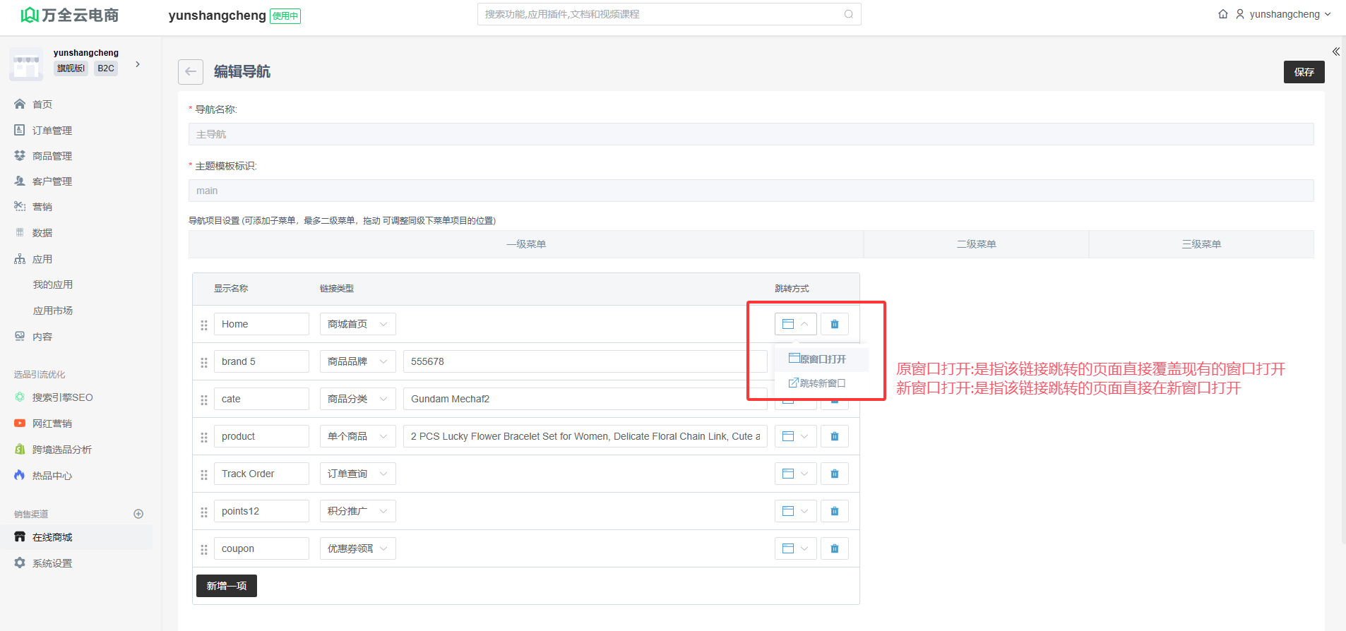 新增:点击“新增一项”新增一级菜单栏,并配置相对于的名称、链接类型及跳转方式