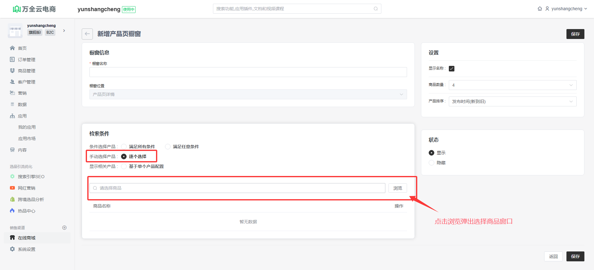 2.手动筛选产品:点击“浏览”勾选需要展示在橱窗的产品
