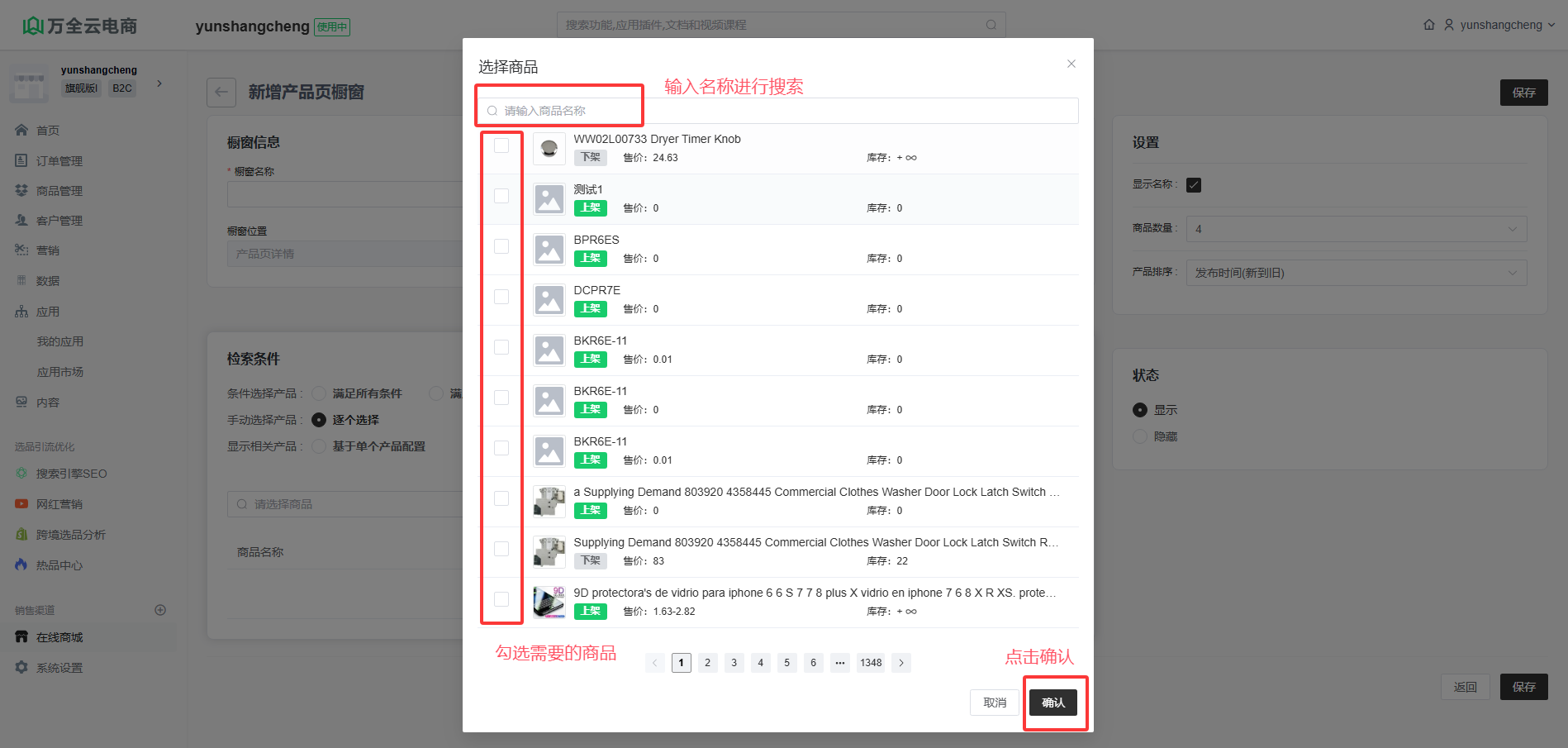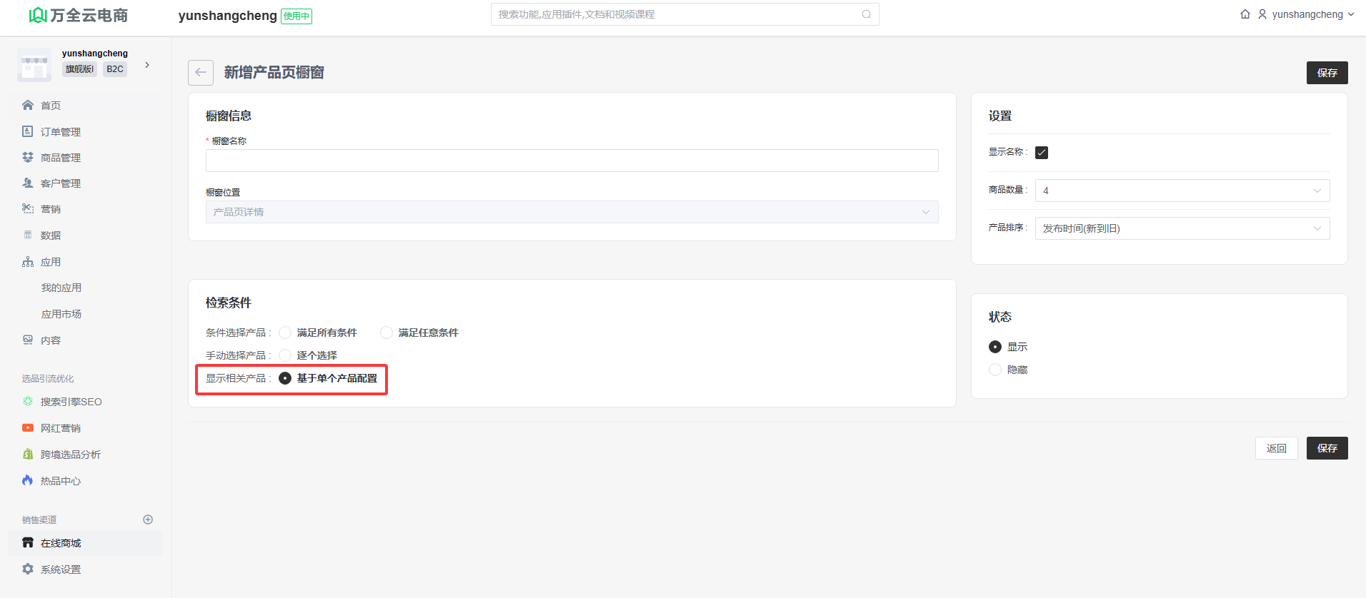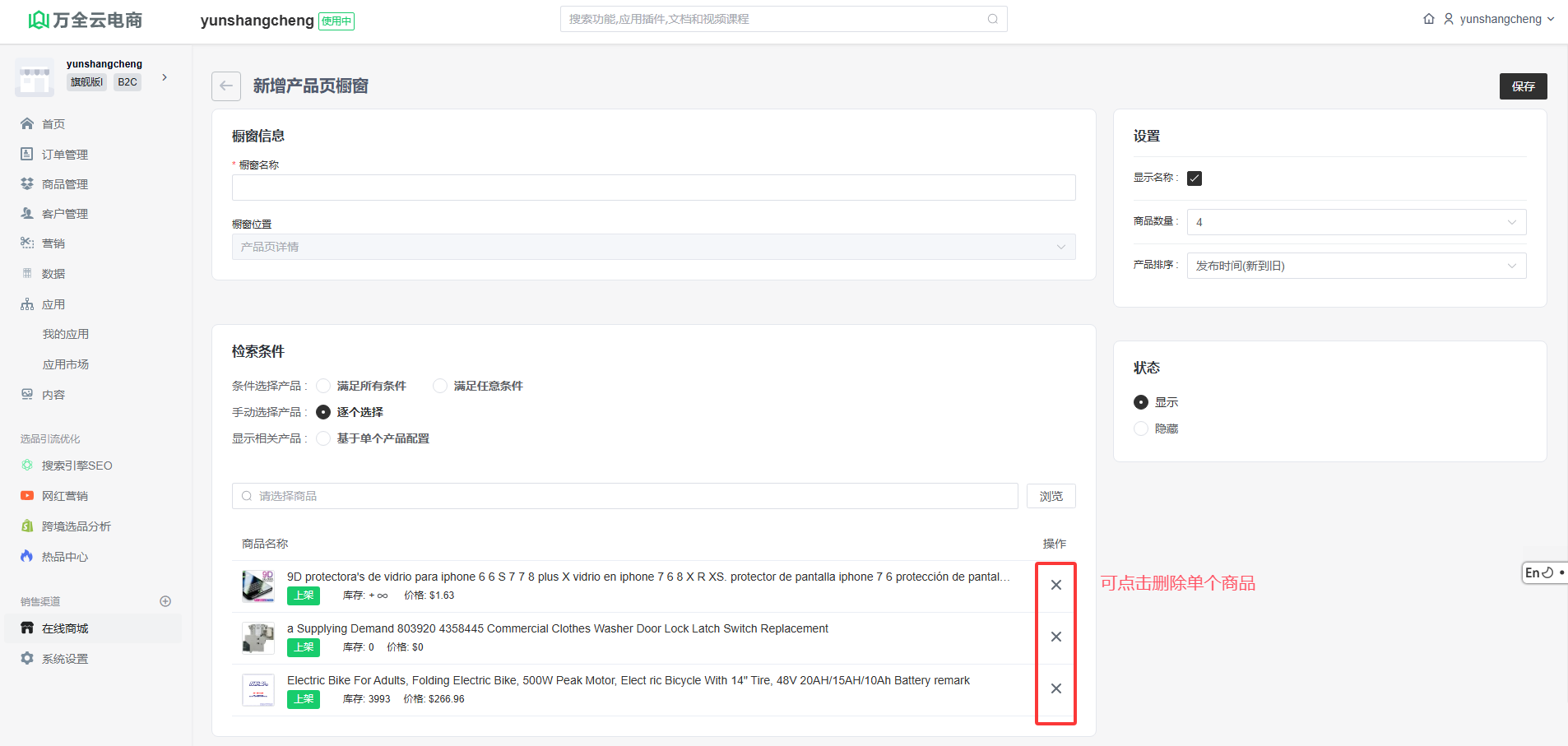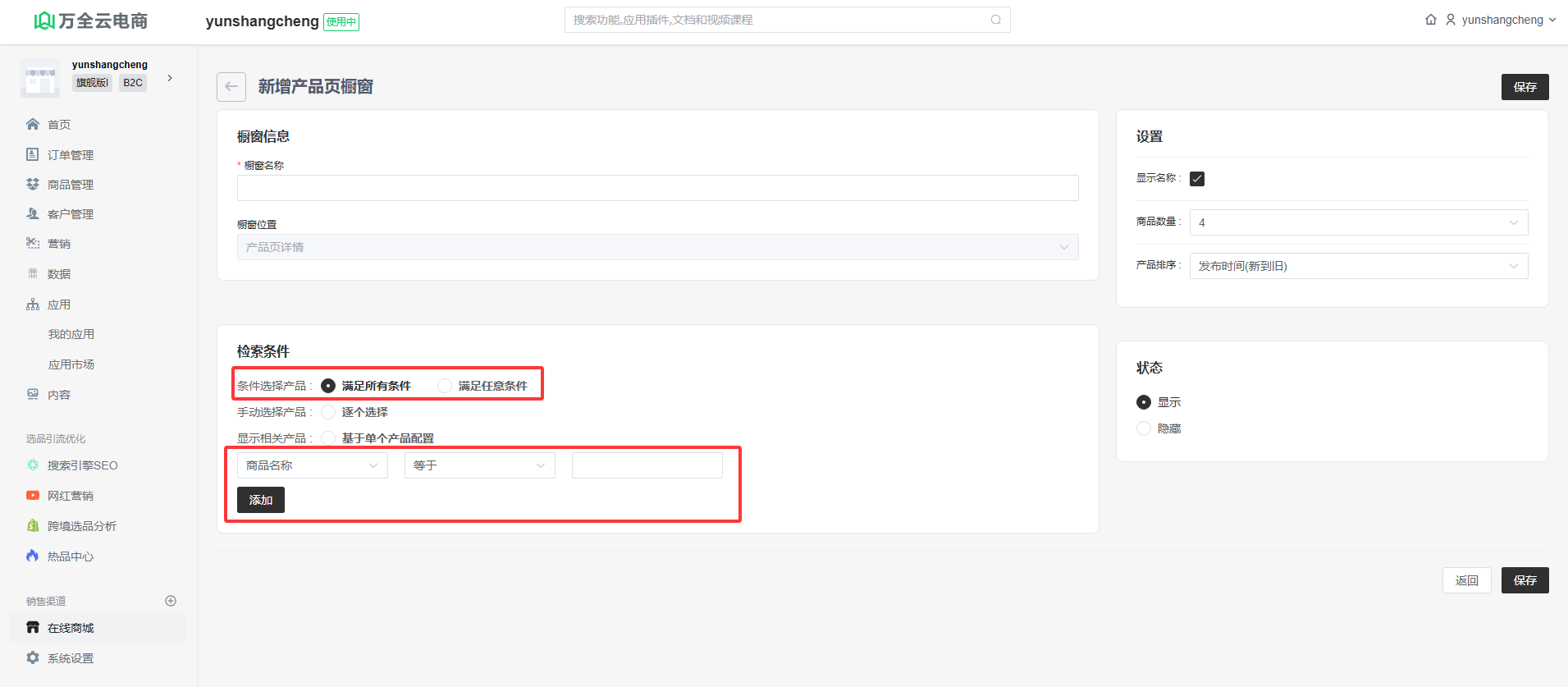 1.条件筛选产品是指根据条件配置筛选产品到橱窗中展示。