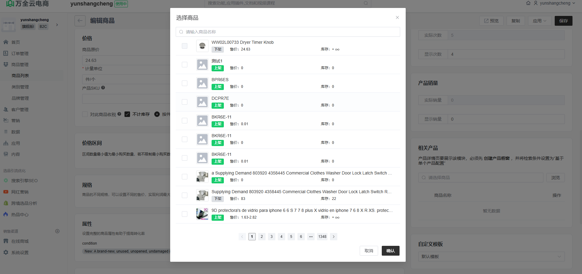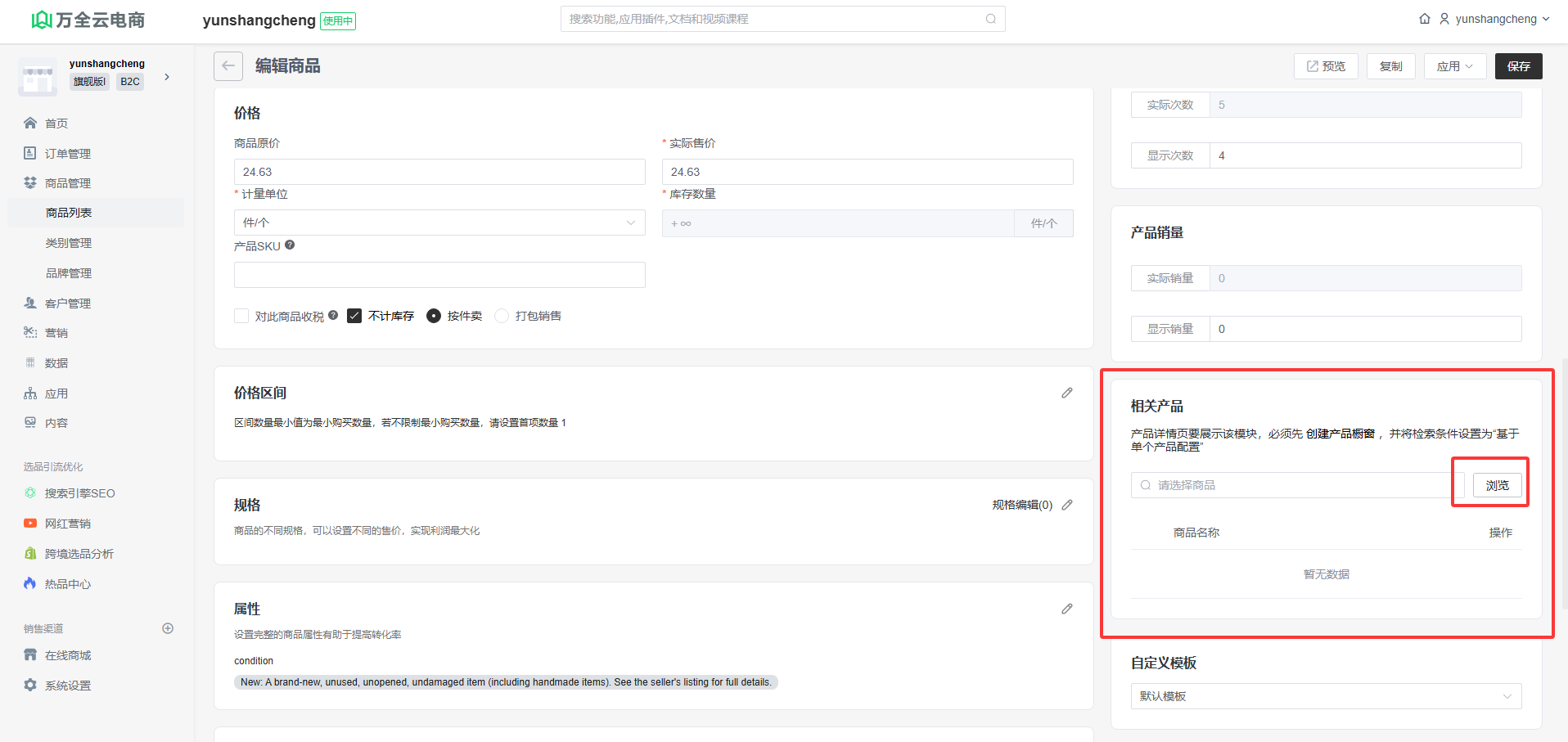 在产品编辑页面相关产品的位置点击“浏览”勾选橱窗展示的产品。
