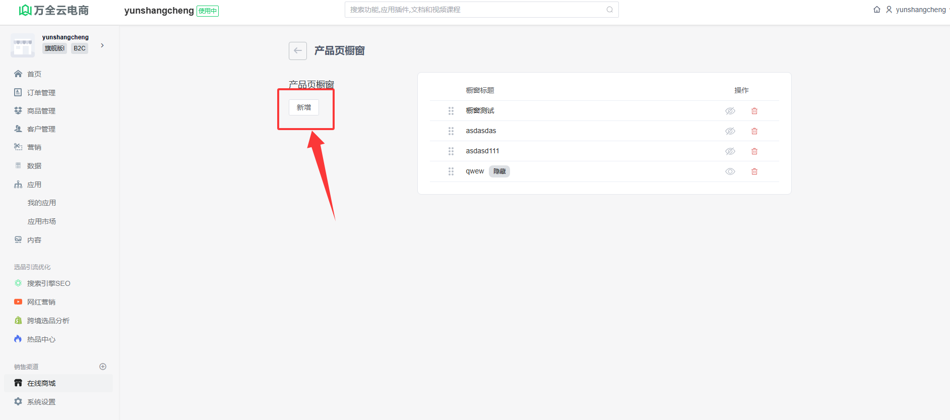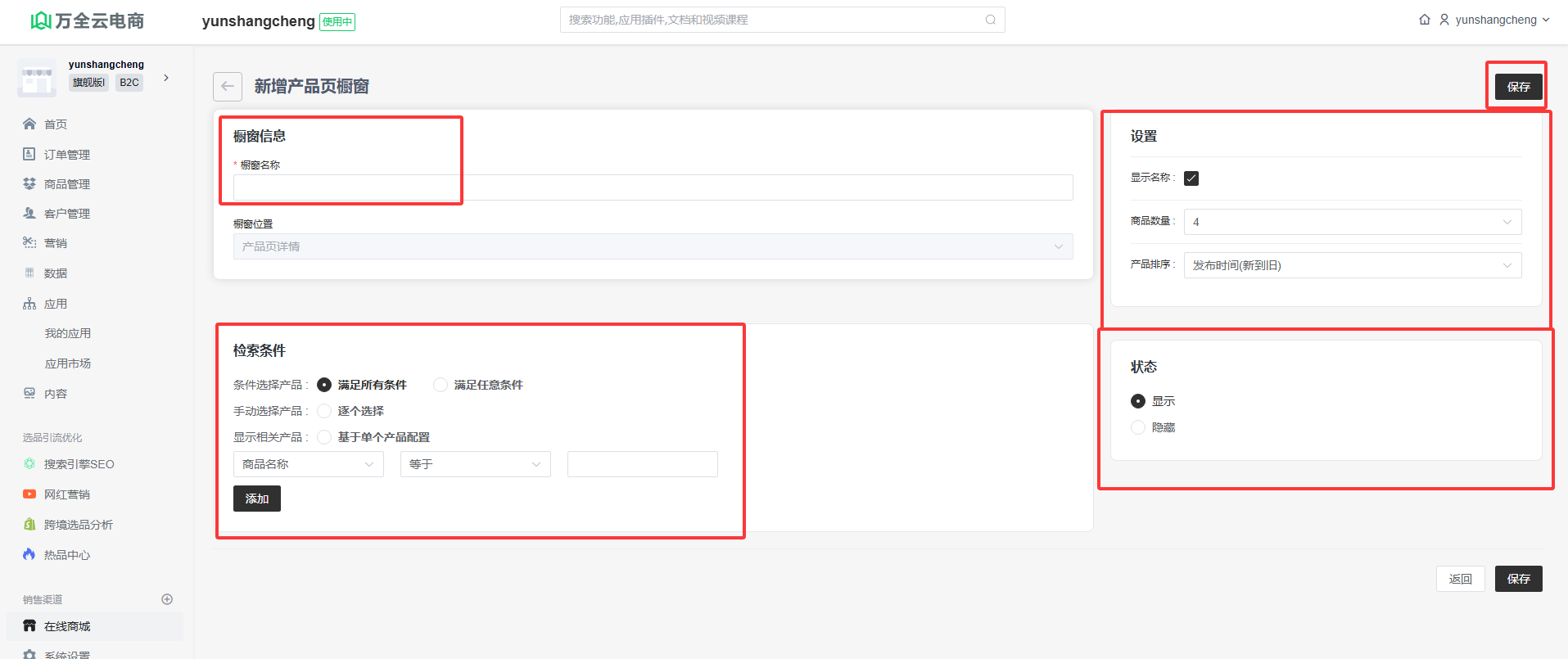 以产品页橱窗为例,点击”新增“按钮进入新增橱窗页面