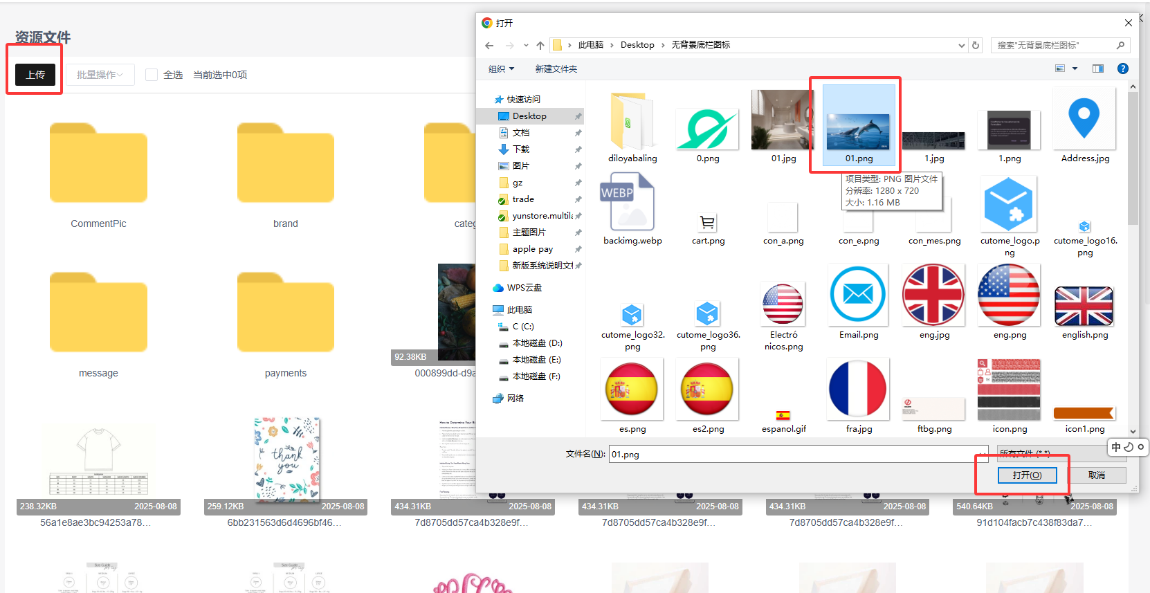 选择需要上传对应的文件夹 — 点击“上传”— 选择本地资源文件—点击“打开”。